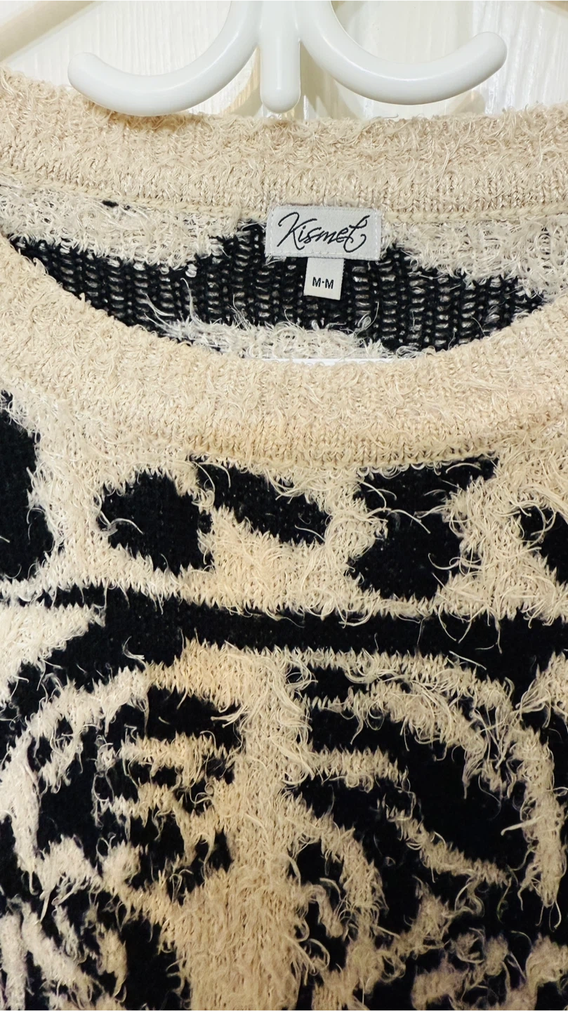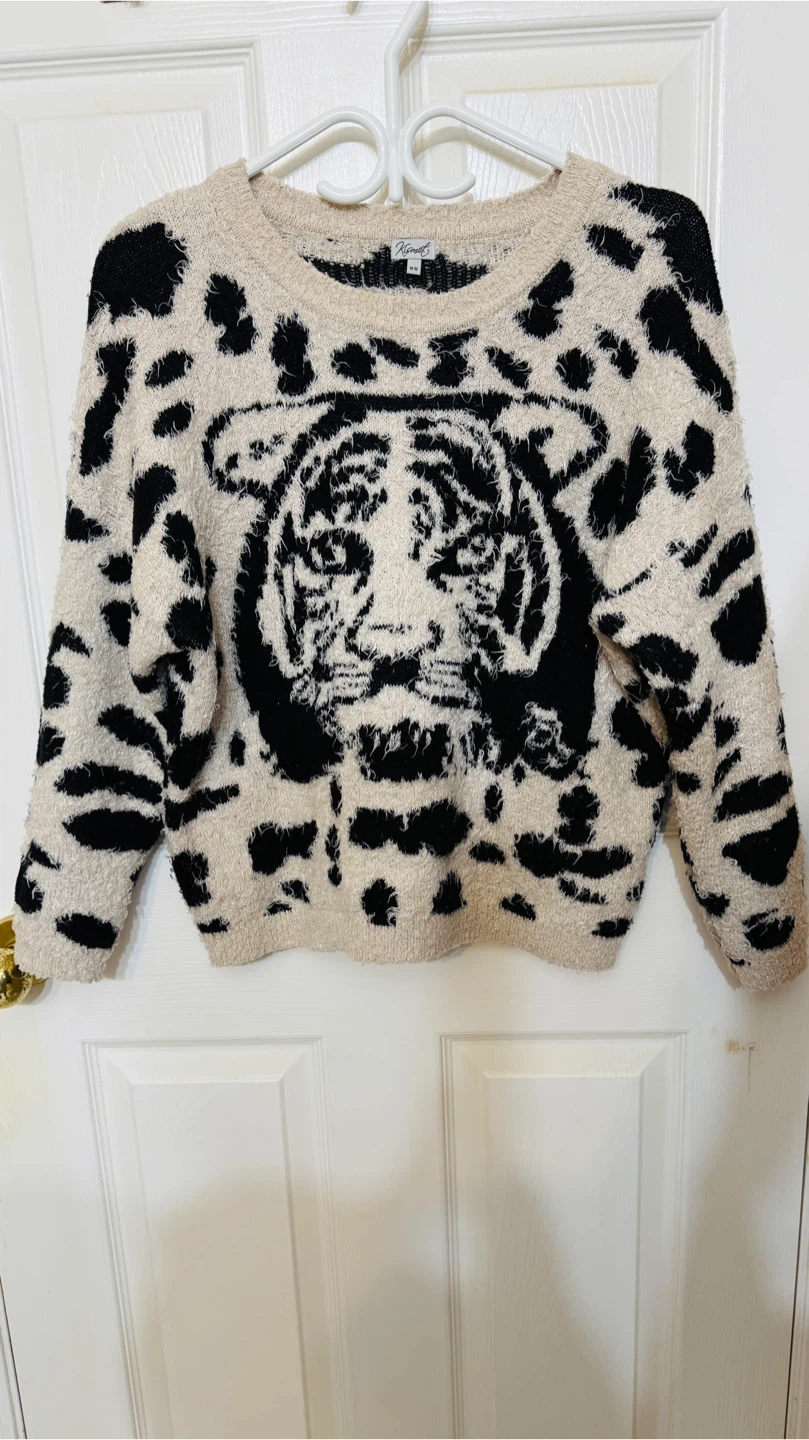 Fuzzy crewneck sweater from Kismet featuring a bold tiger face graphic. It's a size medium. Great for adding a bit of fun to your outfit!