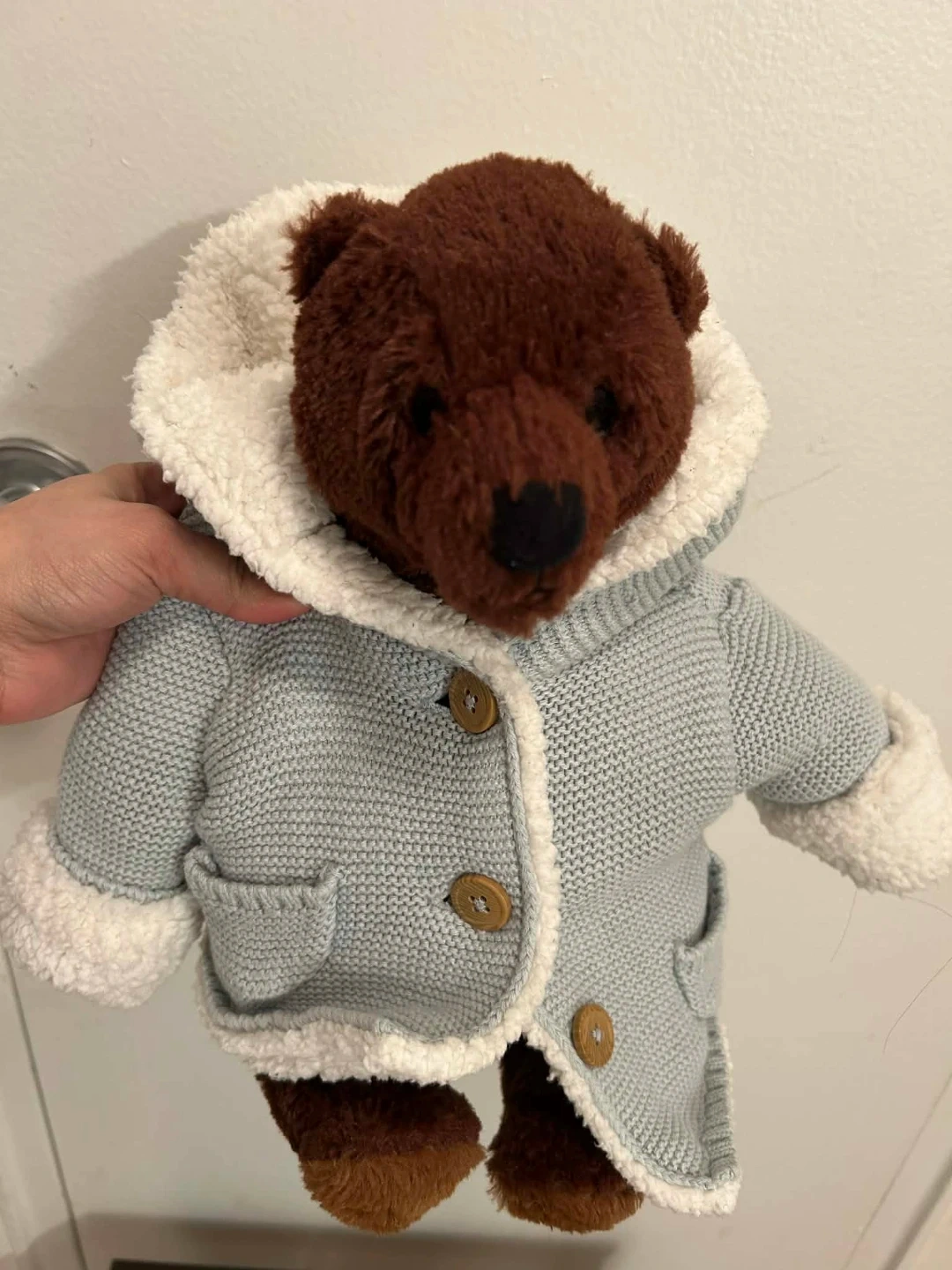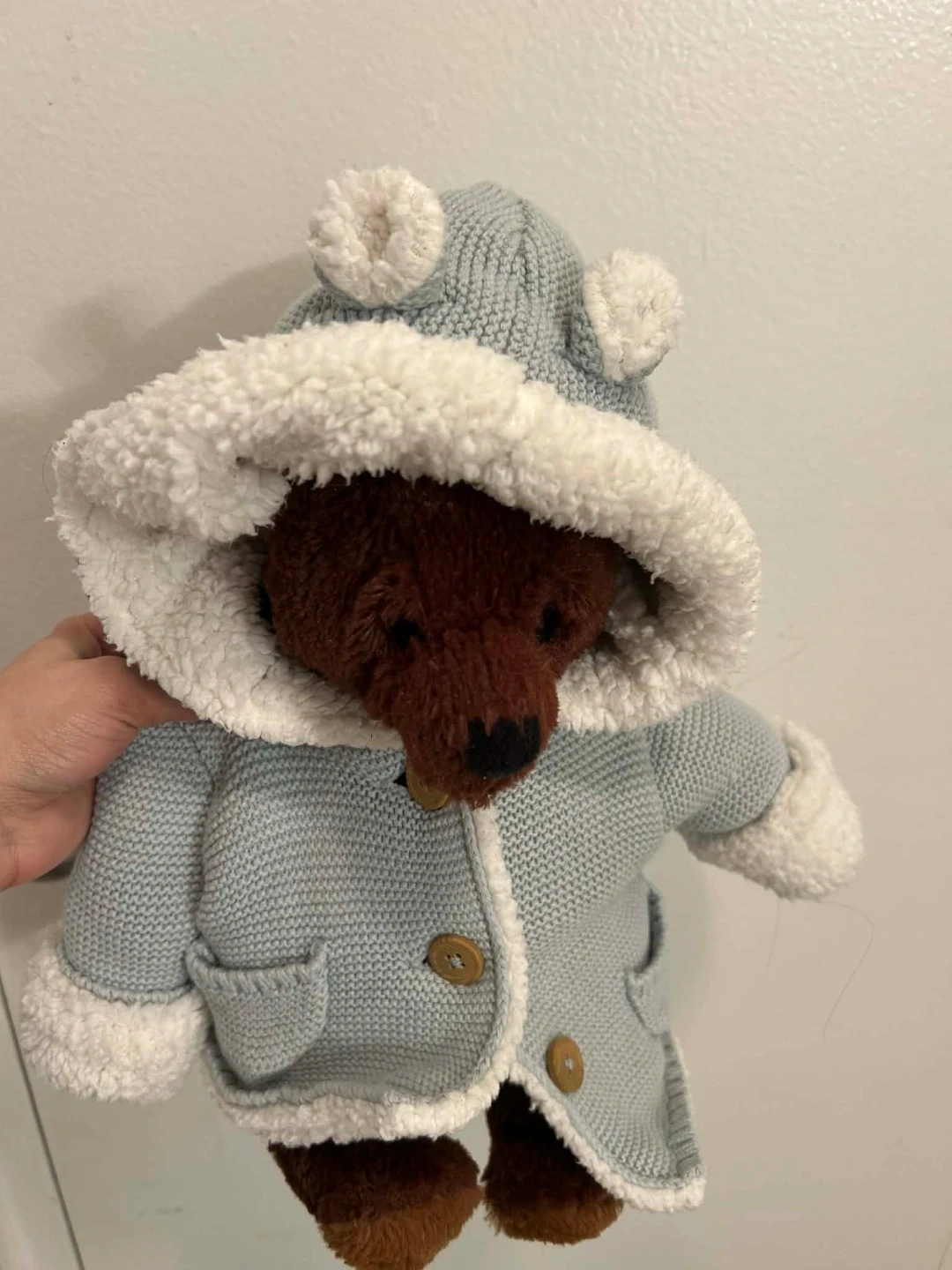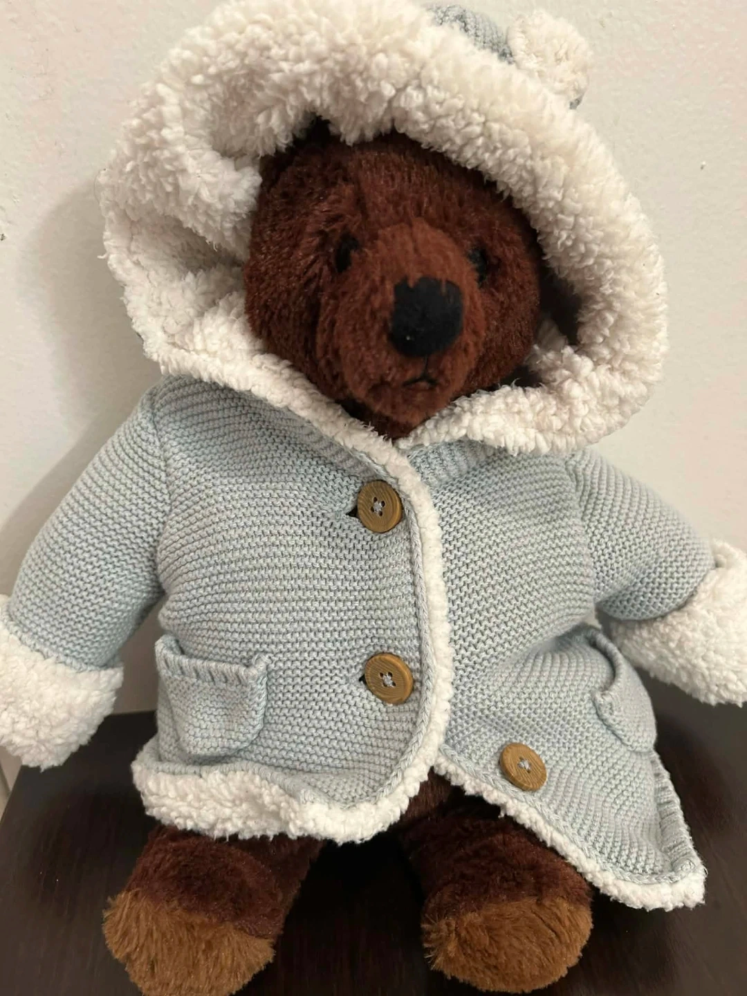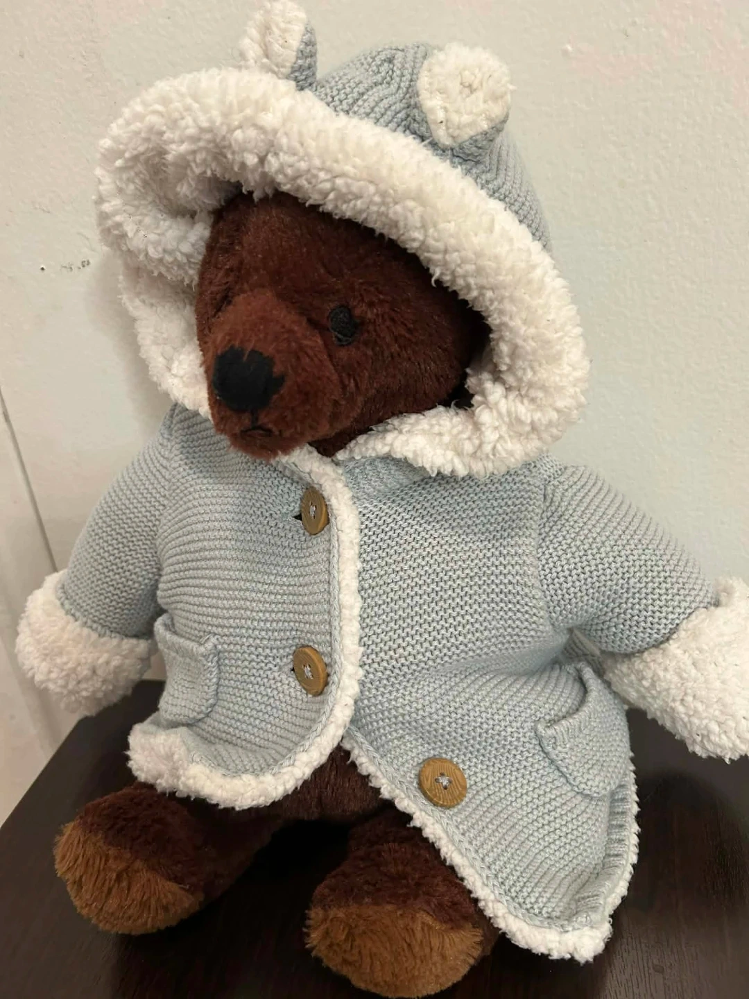 A cute teddy bear dressed in a light blue, hooded knitted coat with fuzzy white trim. The coat fastens with wooden buttons and has two front pockets. It's a cuddly friend ready for adventures!