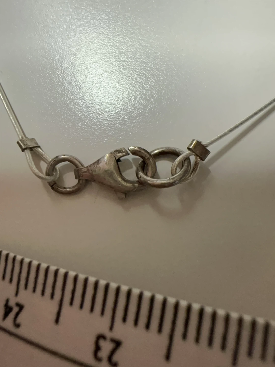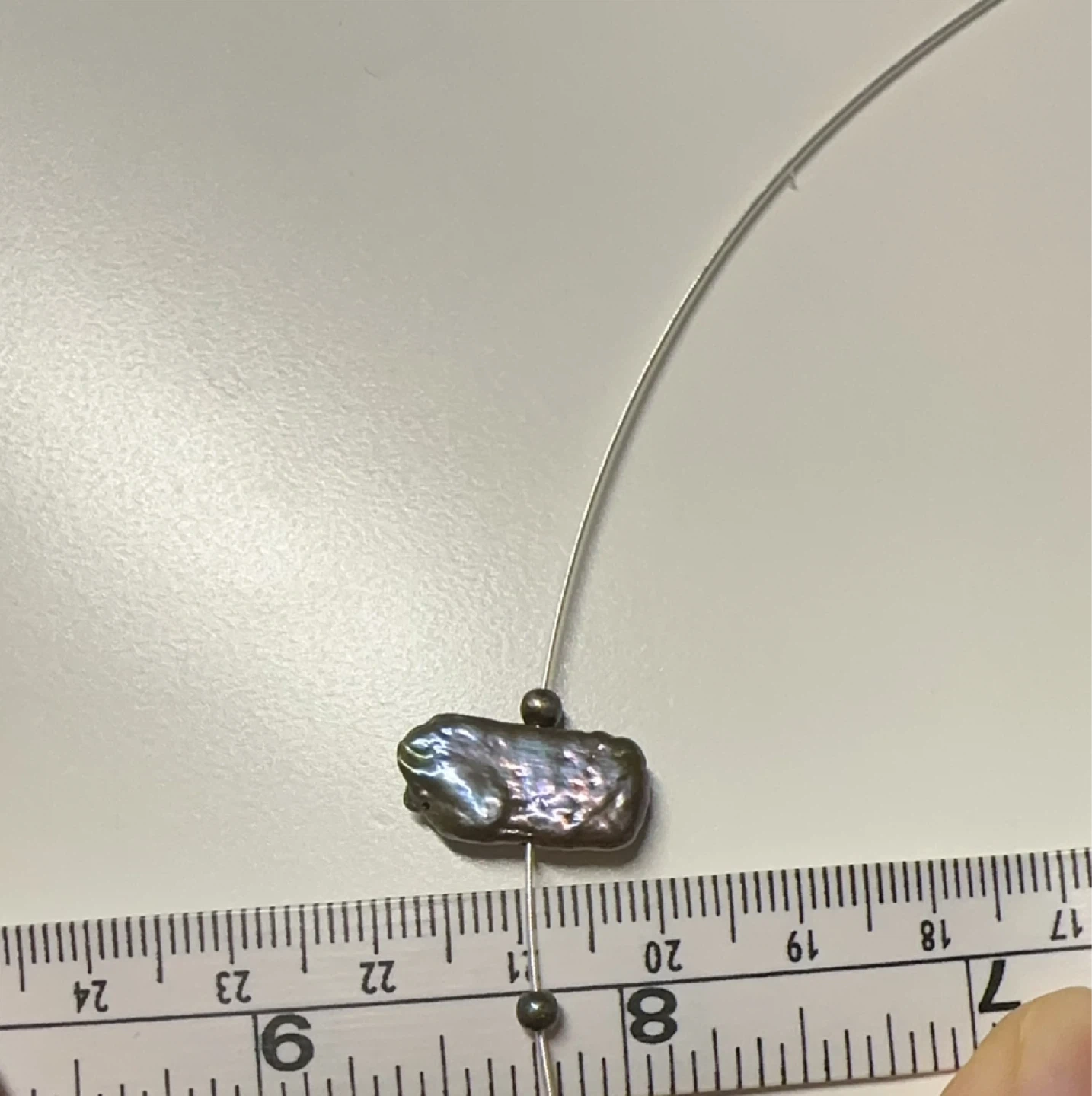 A unique baroque pearl pendant suspended on a thin wire cord. It features a sterling silver clasp closure. The pearl has iridescent qualities with shades of grey, blue, and purple.