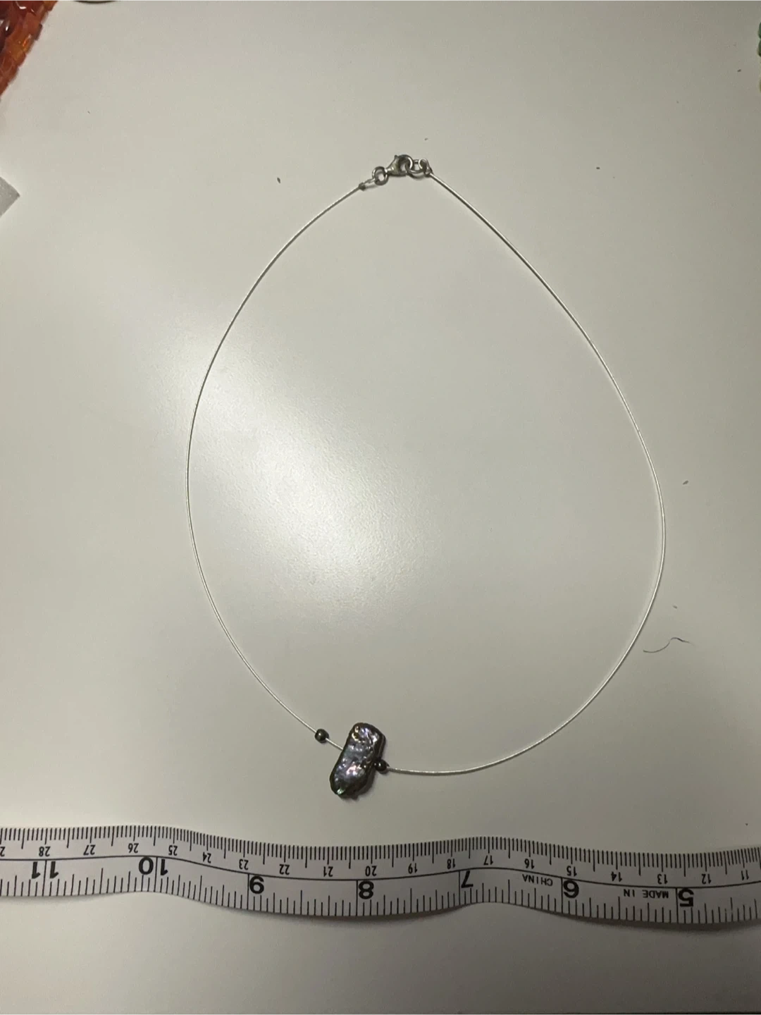 A unique baroque pearl pendant suspended on a thin wire cord. It features a sterling silver clasp closure. The pearl has iridescent qualities with shades of grey, blue, and purple.