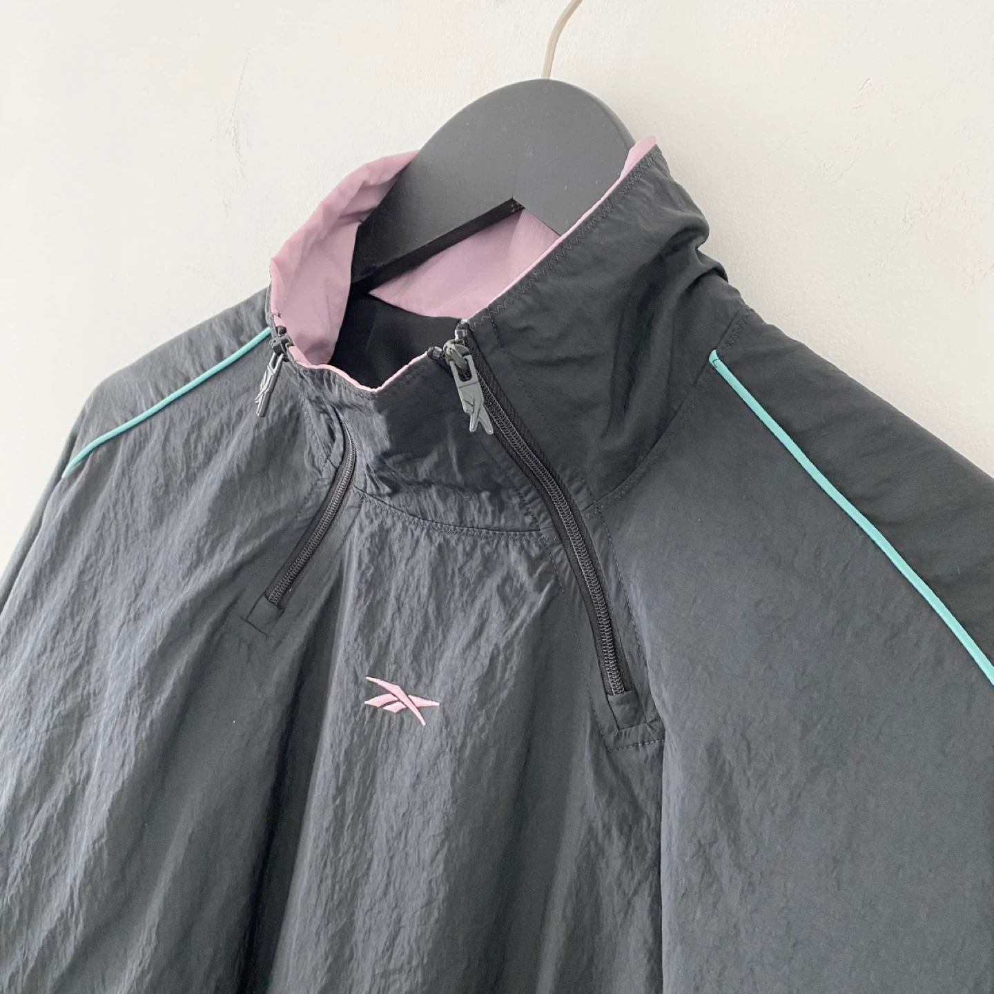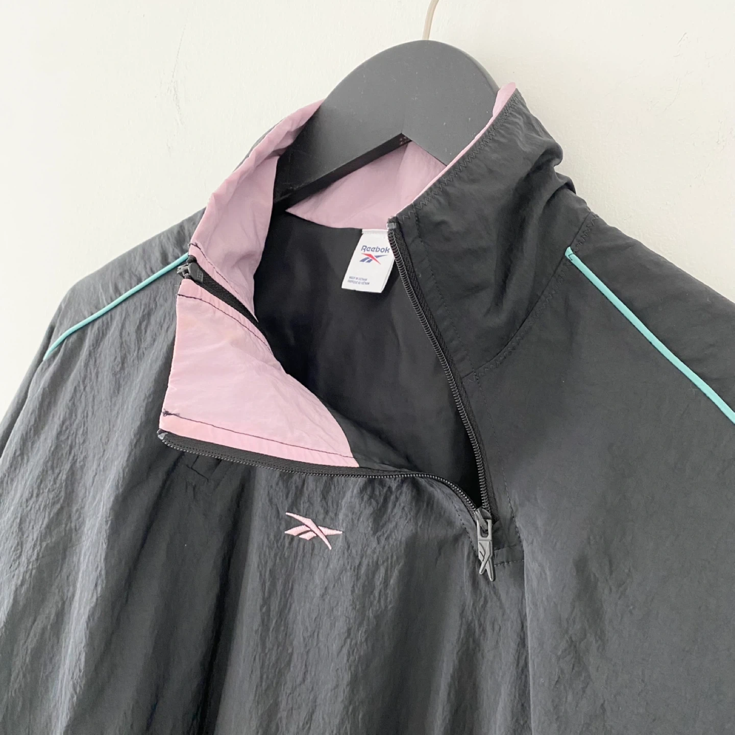 Reebok heritage windbreaker with zipped mockneck. It also features batwing sleeves, contrast corded piping and elasticated waist band. There's no staining or damage, Ots clean and in excellent condition.