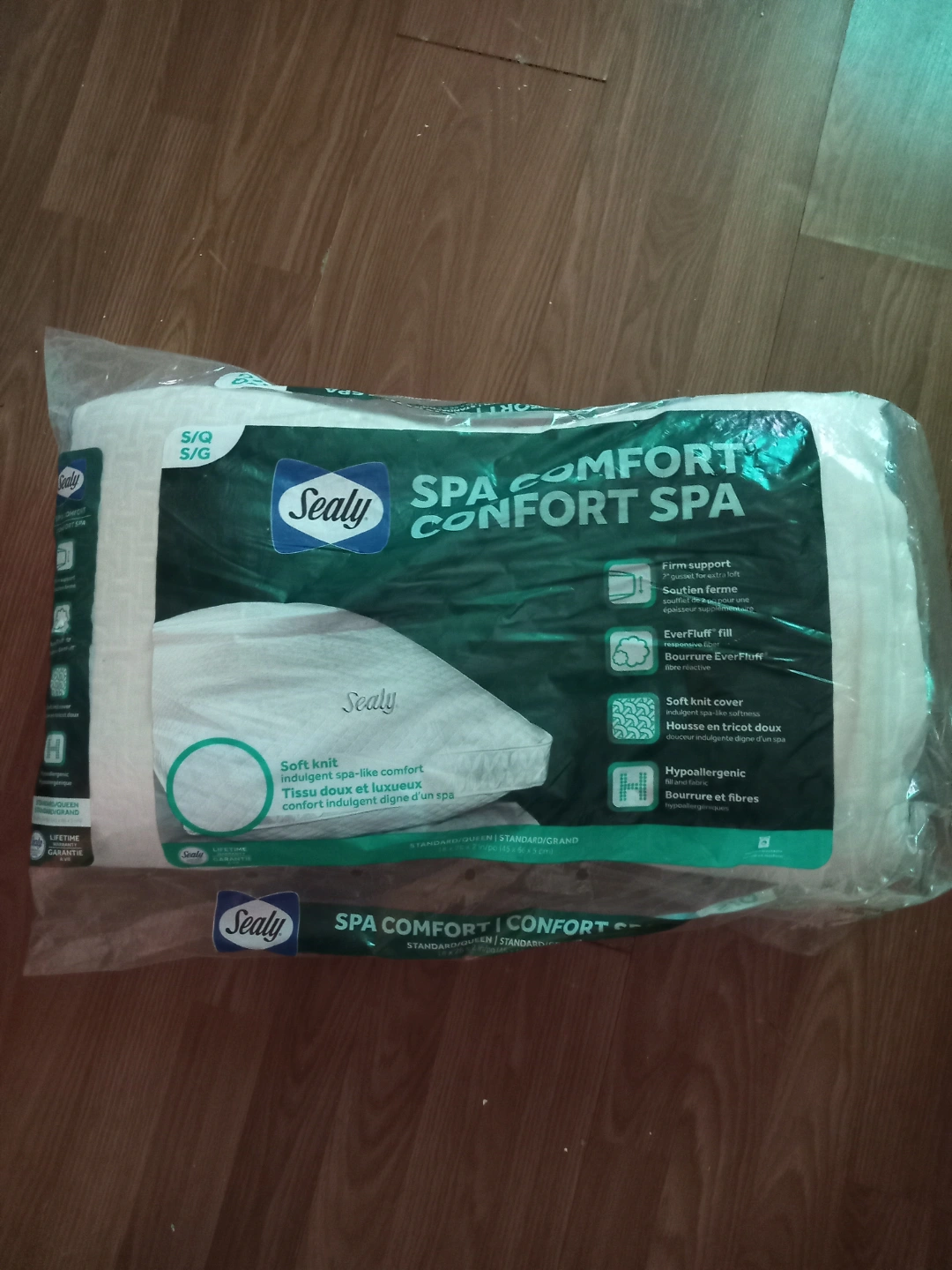 New Sealy Spa Comfort pillow. Soft knit, spa-like comfort. Firm support. Hypoallergenic. Packaged in plastic.