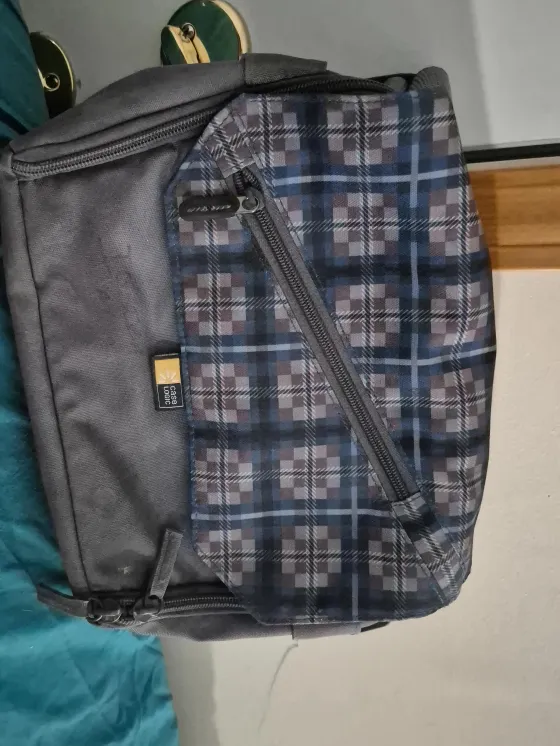 This is a Case Logic camera bag. It has a grey canvas exterior with a blue and grey plaid front panel. The bag features multiple zippered compartments for storage.