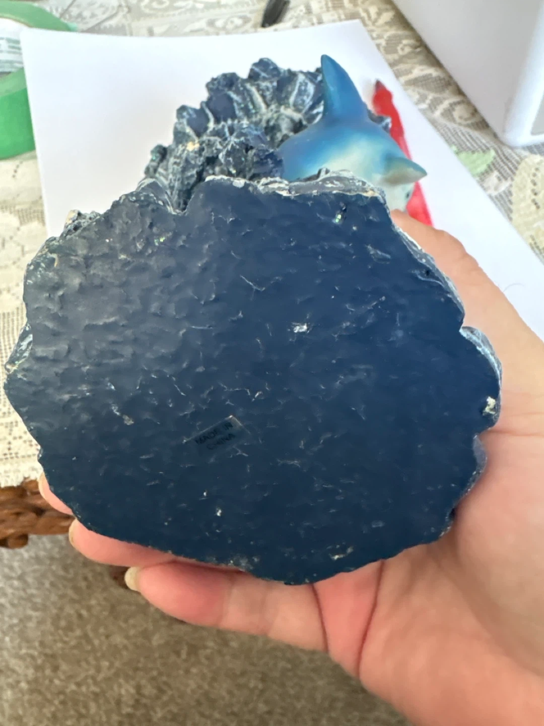 This decorative dish features two dolphins leaping through a blue, wave-like structure with glitter accents. It's ideal for holding small trinkets or keys. Cash only. Pickup SE vancouver. If listed. It’s available.