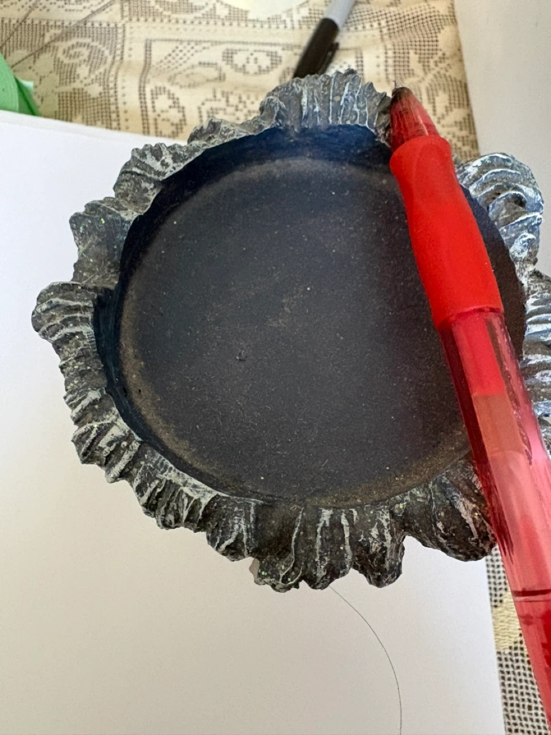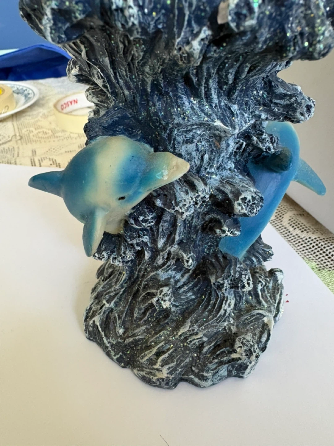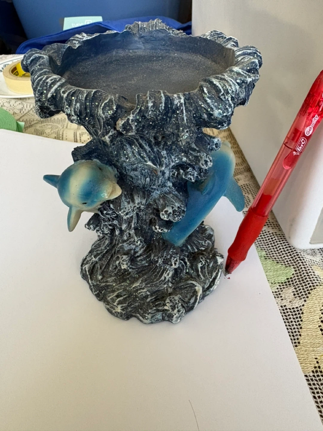 This decorative dish features two dolphins leaping through a blue, wave-like structure with glitter accents. It's ideal for holding small trinkets or keys. Cash only. Pickup SE vancouver. If listed. It’s available.