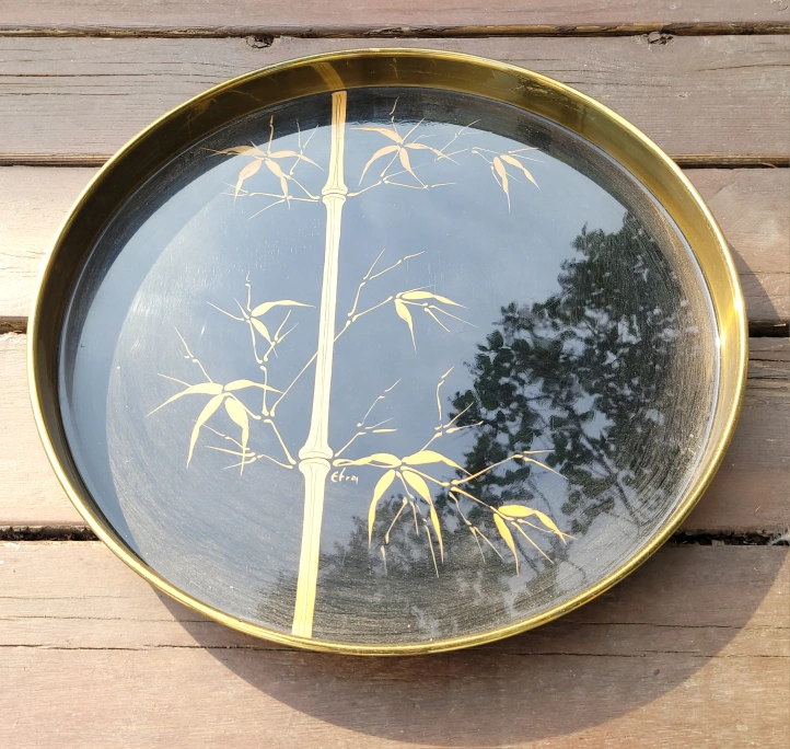 Selling a vintage Efram round tray featuring a lovely bamboo design. It has a gold-tone rim and a black background. Perfect for adding a touch of retro charm to your home!