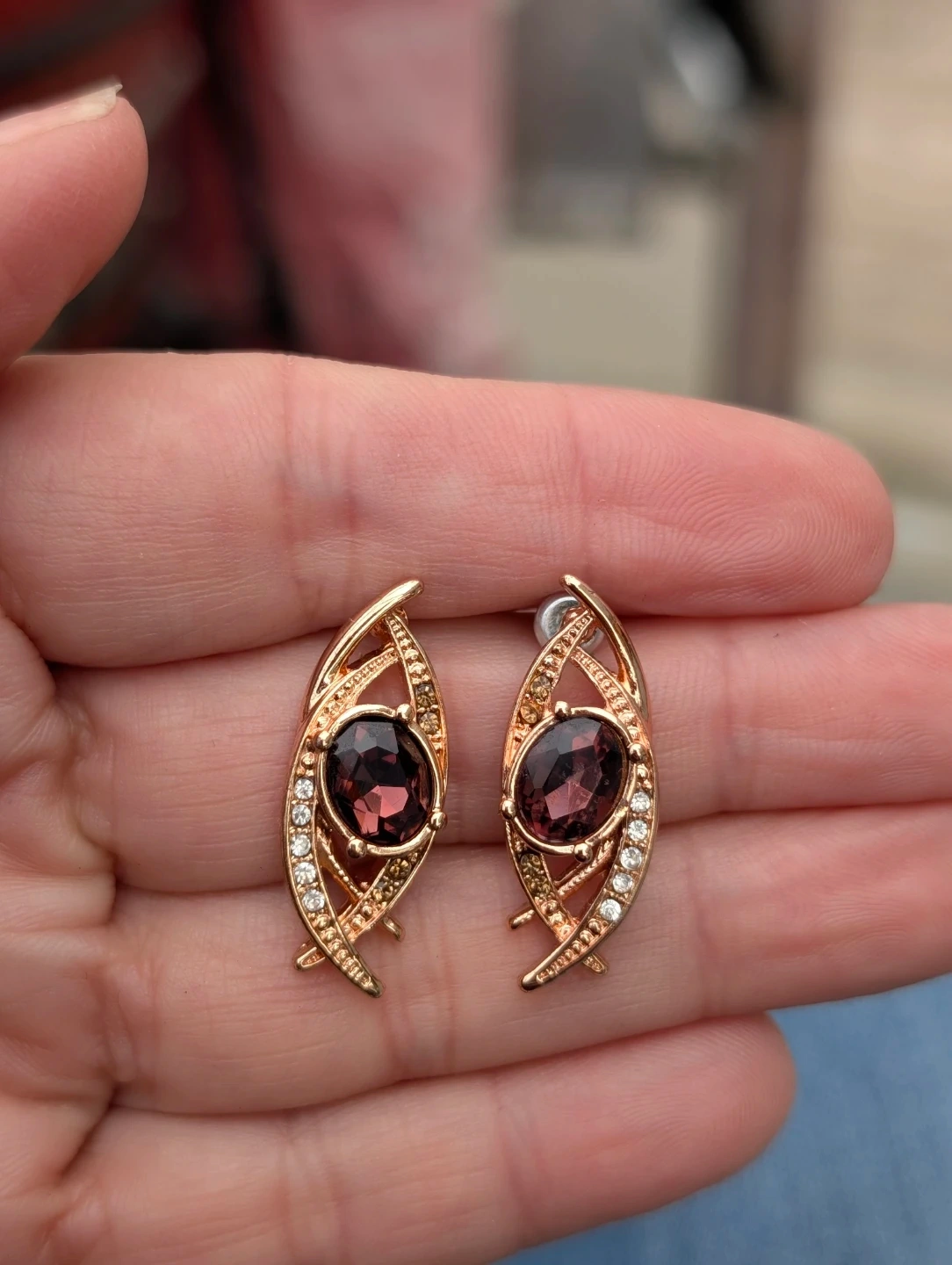 These elegant earrings feature a deep purple central stone surrounded by sparkling rhinestones. The gold-tone metal has a unique, abstract design. They're lightweight and secure with post backs. Perfect for adding a touch of sparkle to any outfit!