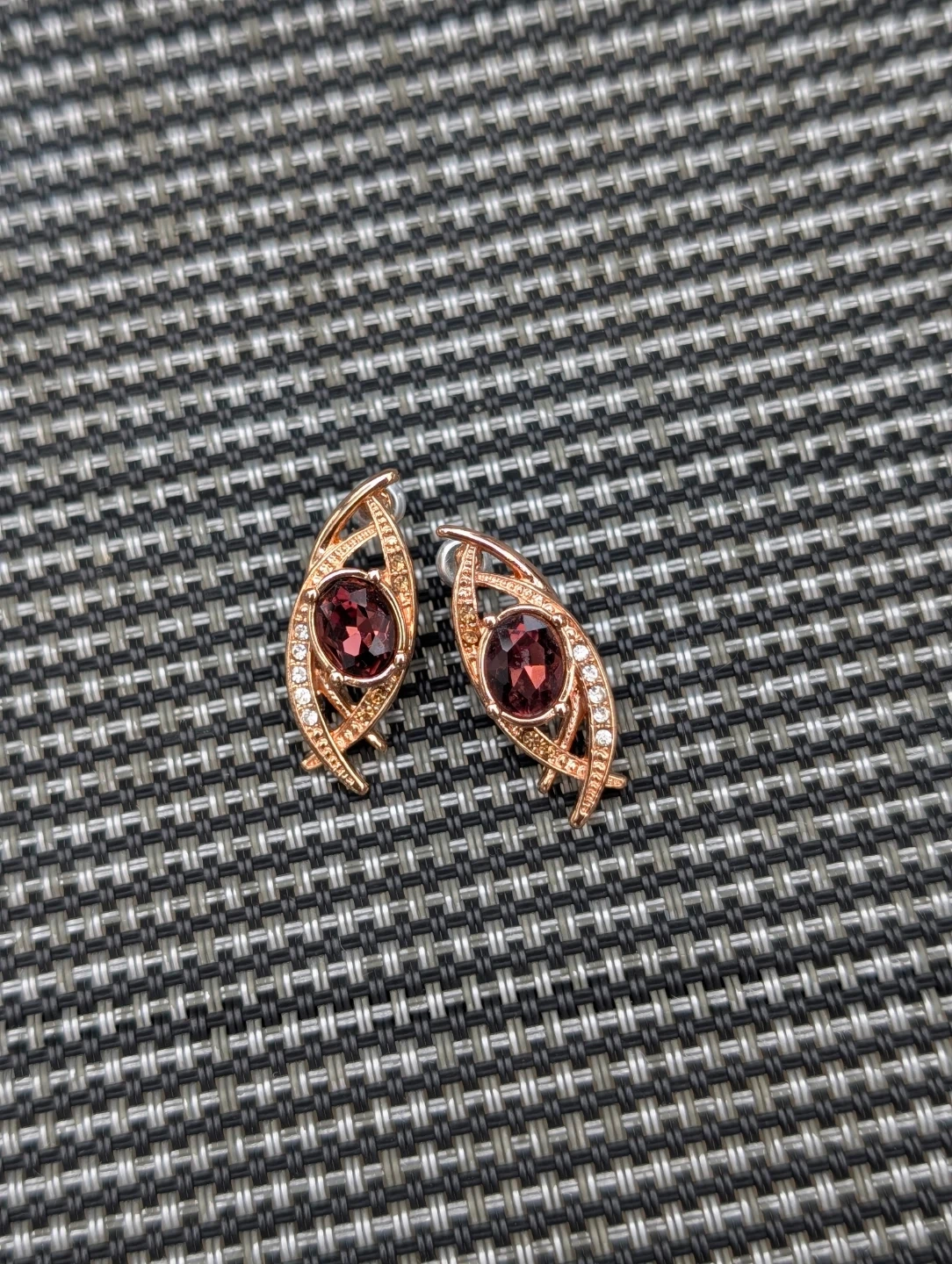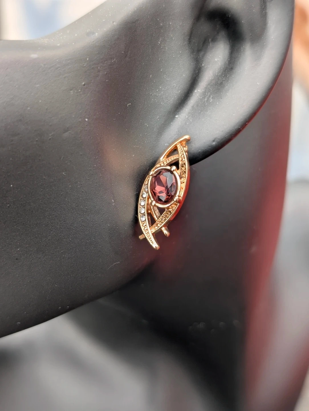 These elegant earrings feature a deep purple central stone surrounded by sparkling rhinestones. The gold-tone metal has a unique, abstract design. They're lightweight and secure with post backs. Perfect for adding a touch of sparkle to any outfit!