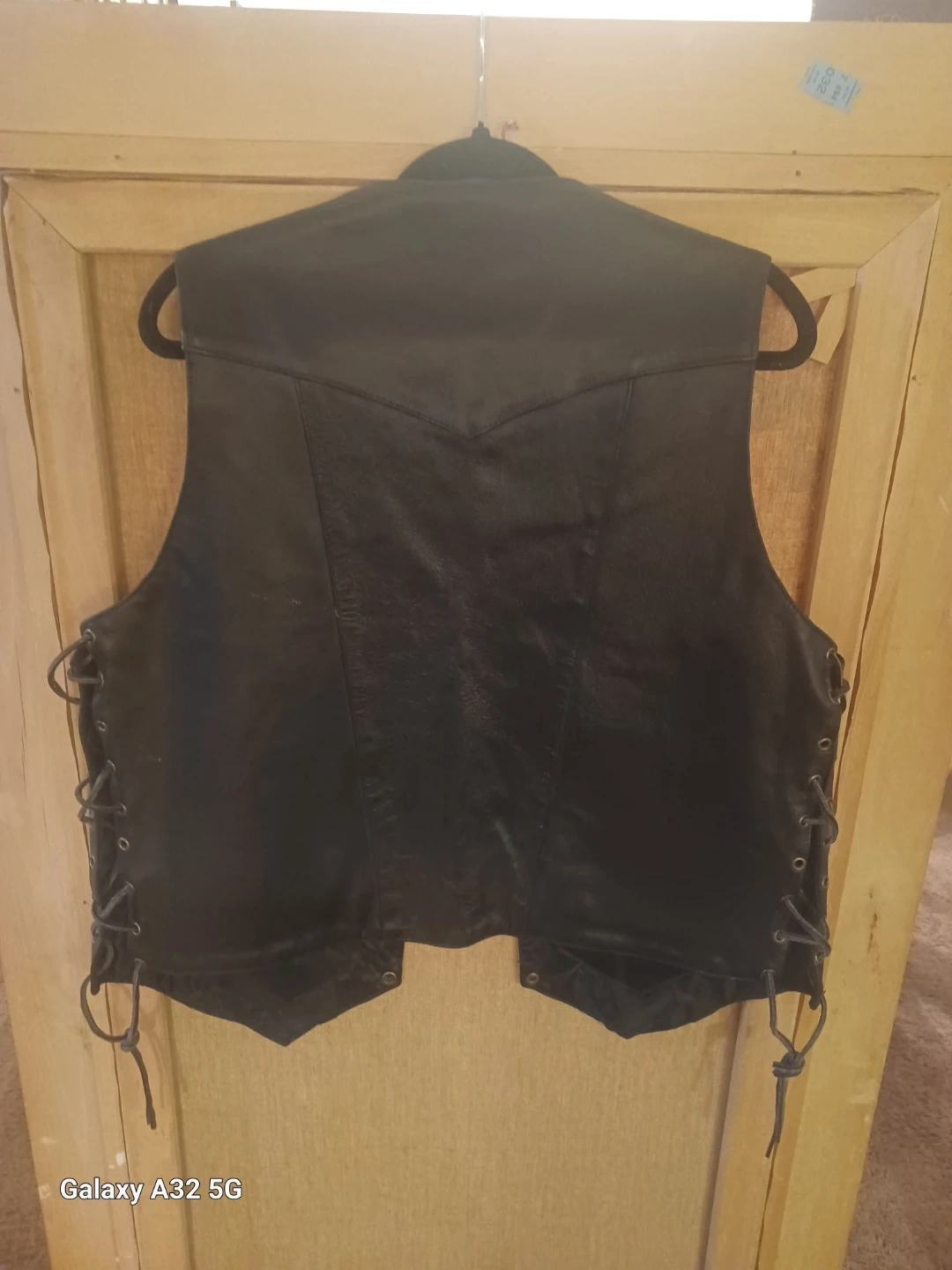 Large black leather vest for motorcycle riders. It's made of genuine leather with lace-up sides. Features two front pockets with zipper closures and is in excellent condition.