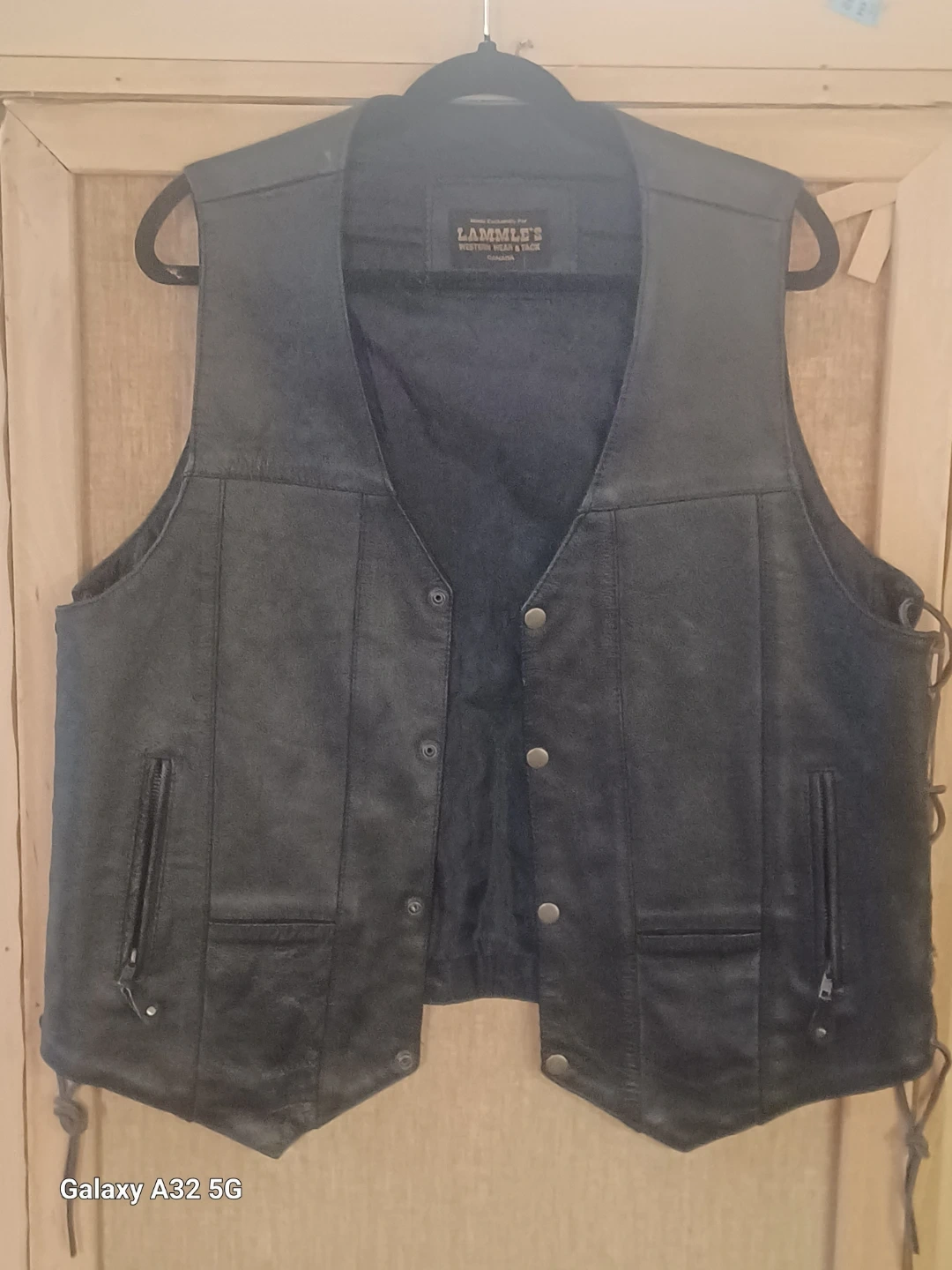 Large black leather vest for motorcycle riders. It's made of genuine leather with lace-up sides. Features two front pockets with zipper closures and is in excellent condition.