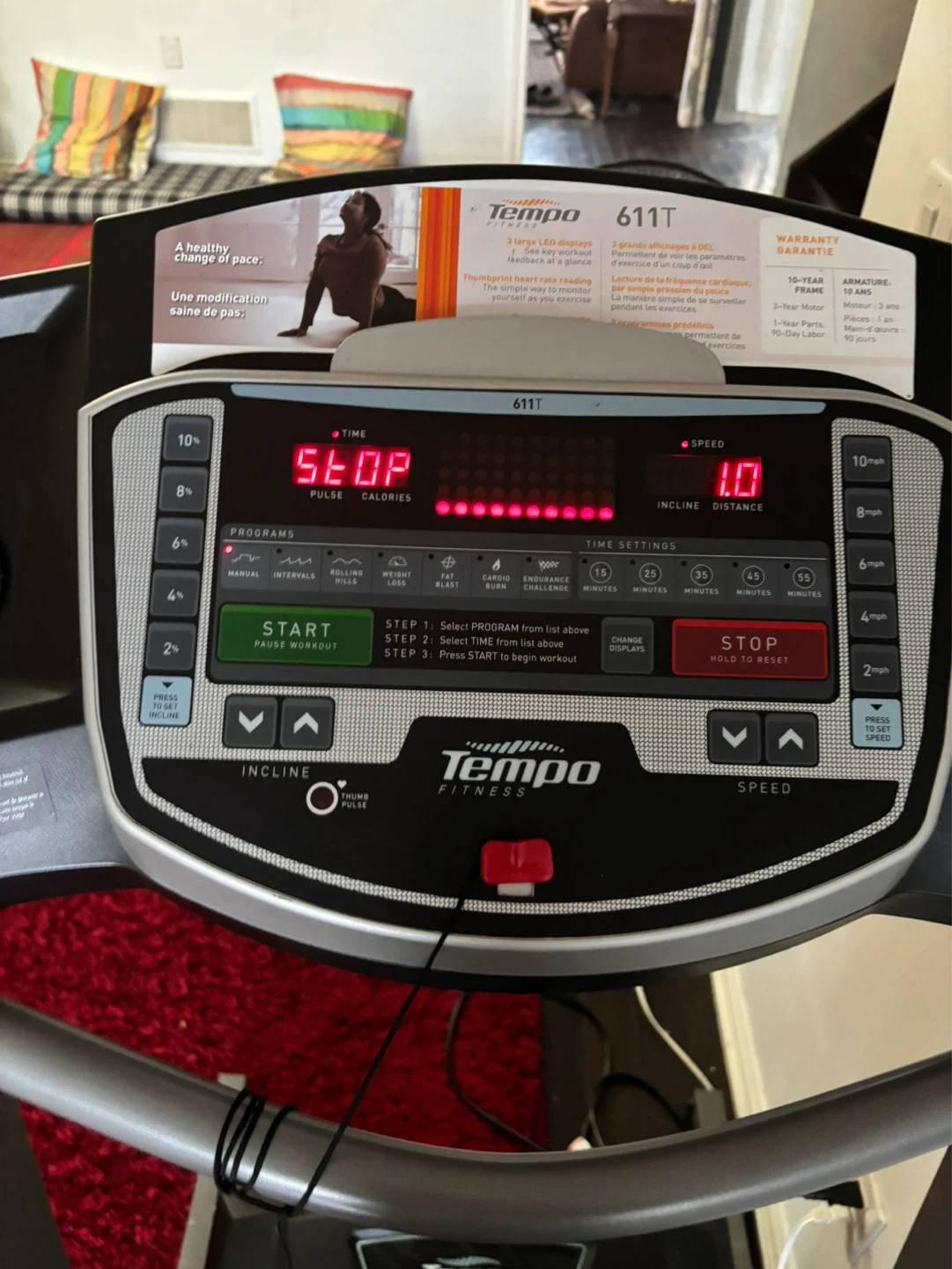 Tempo Fitness 611T treadmill with a 3-year motor warranty. It features multiple workout programs and adjustable speed and incline settings. Perfect for home cardio workouts!