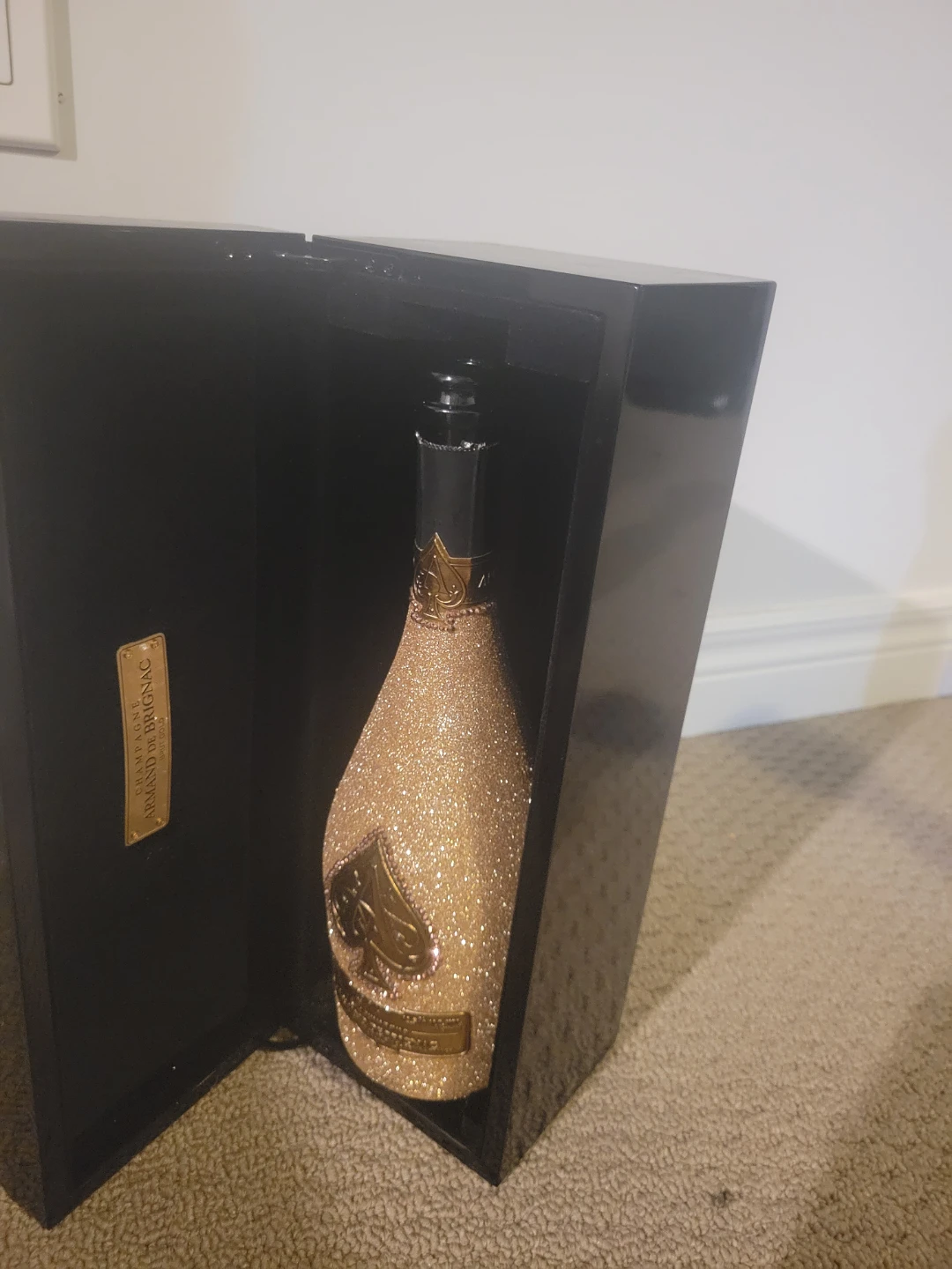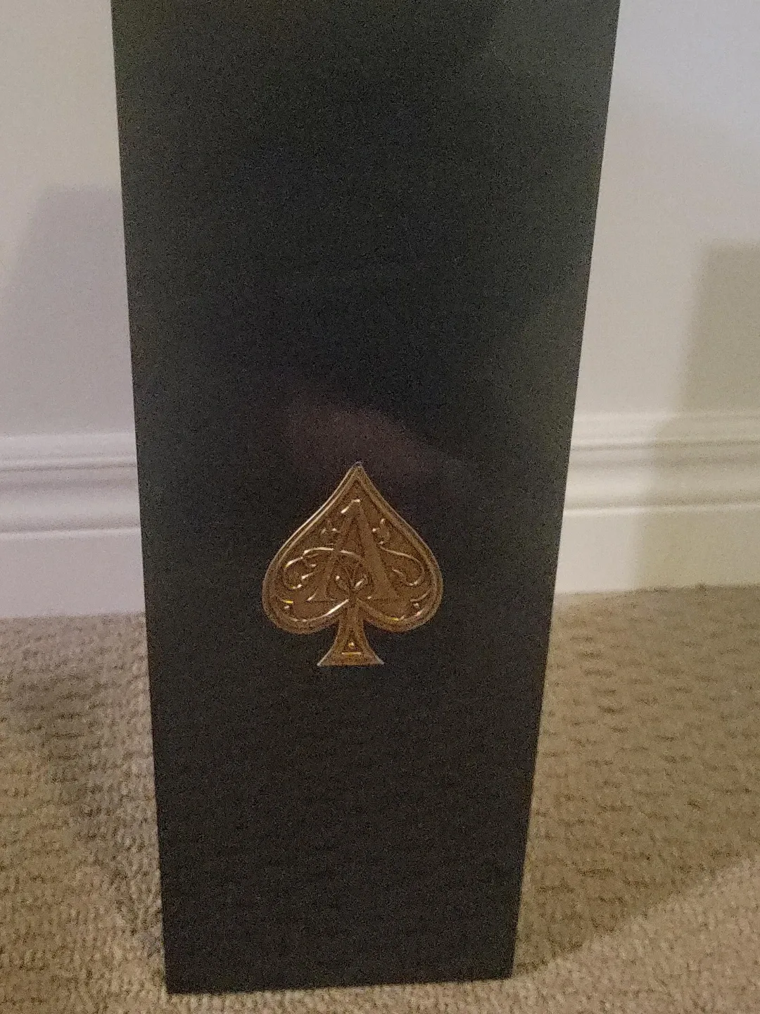 This is a bottle of Armand de Brignac Ace of Spades Brut Gold Champagne. It comes in a black lacquered presentation box. For decoration.