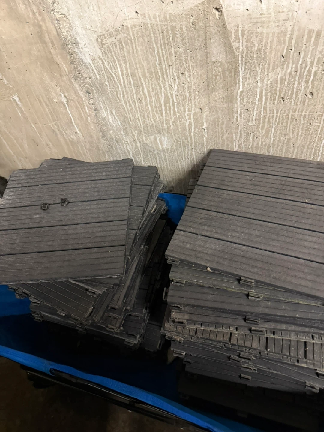 Bundle of interlocking deck tiles for outdoor flooring. Black, plastic material. Easy to connect and customize your space.