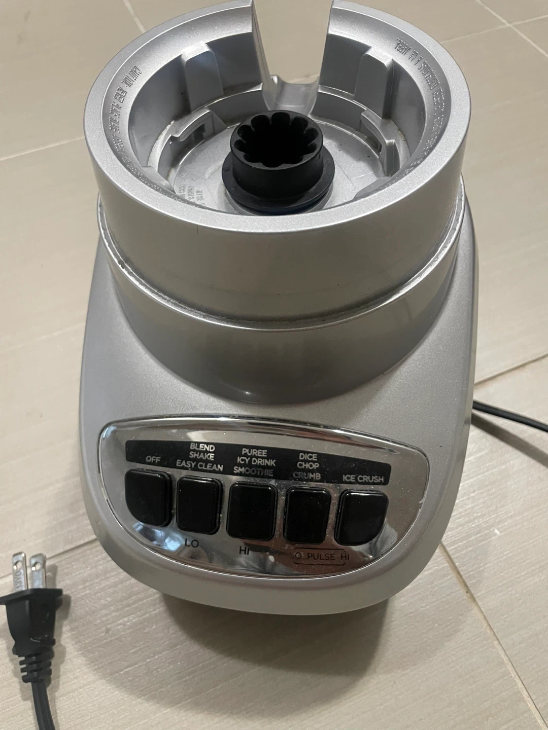 This is a Black + Decker blender base and lid. It has multiple settings including Blend, Puree, Easy Clean, Icy Drink, Dice, Smoothie, and Ice Crush. This blender is silver and comes with its cord and lid. Glass is broken but machine is working and in good condition.