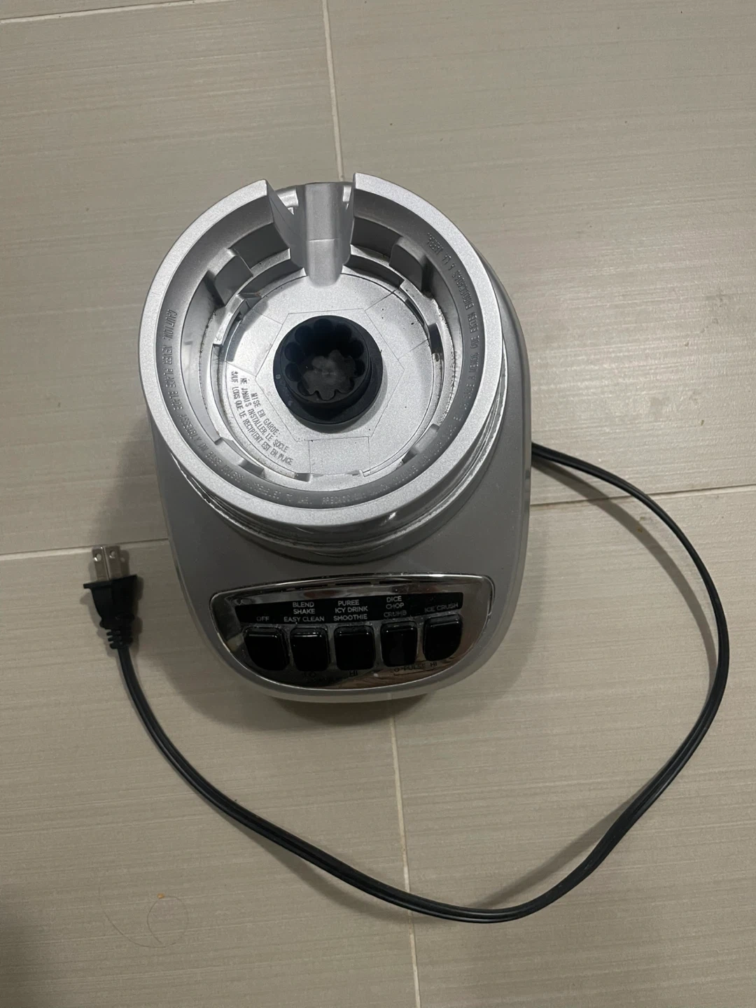 This is a Black + Decker blender base and lid. It has multiple settings including Blend, Puree, Easy Clean, Icy Drink, Dice, Smoothie, and Ice Crush. This blender is silver and comes with its cord and lid. Glass is broken but machine is working and in good condition.
