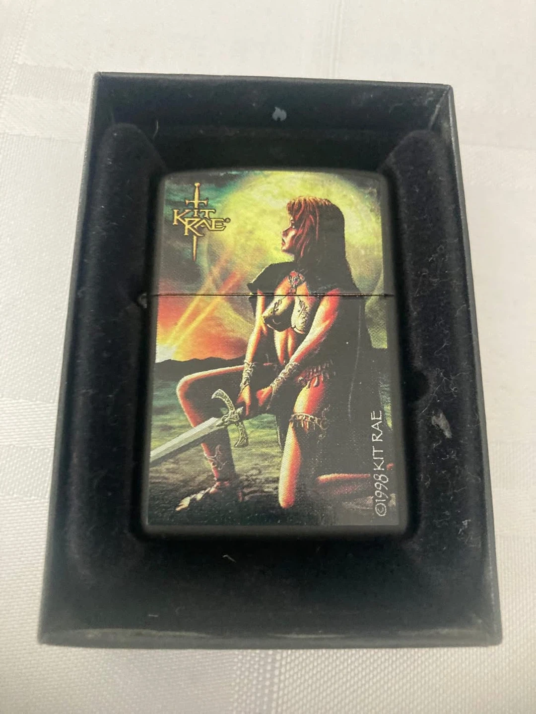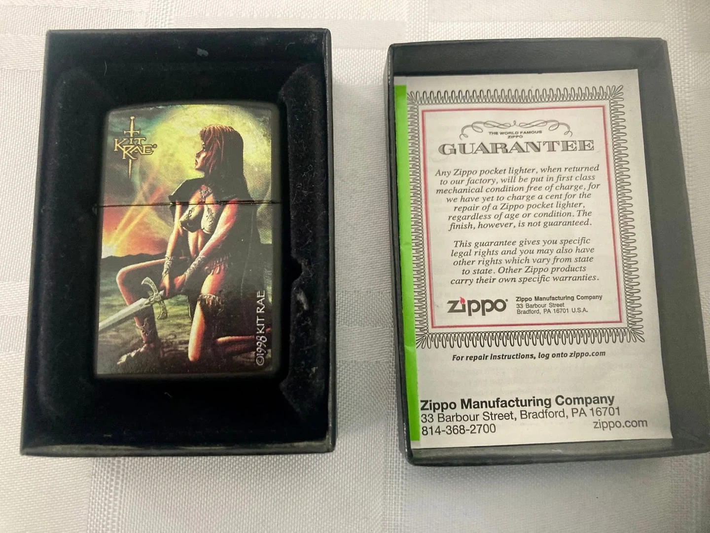 This collectible Zippo lighter features a Kit Rae design and comes complete with its original box and paperwork, showcasing its excellent condition. It's a unique piece for any Zippo enthusiast or collector of fantasy art. This is a used item.