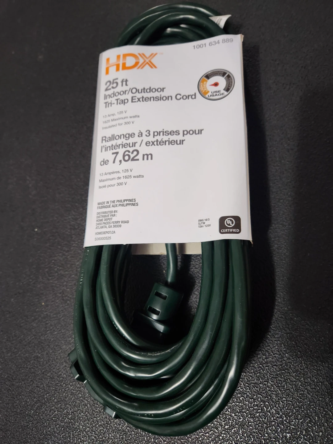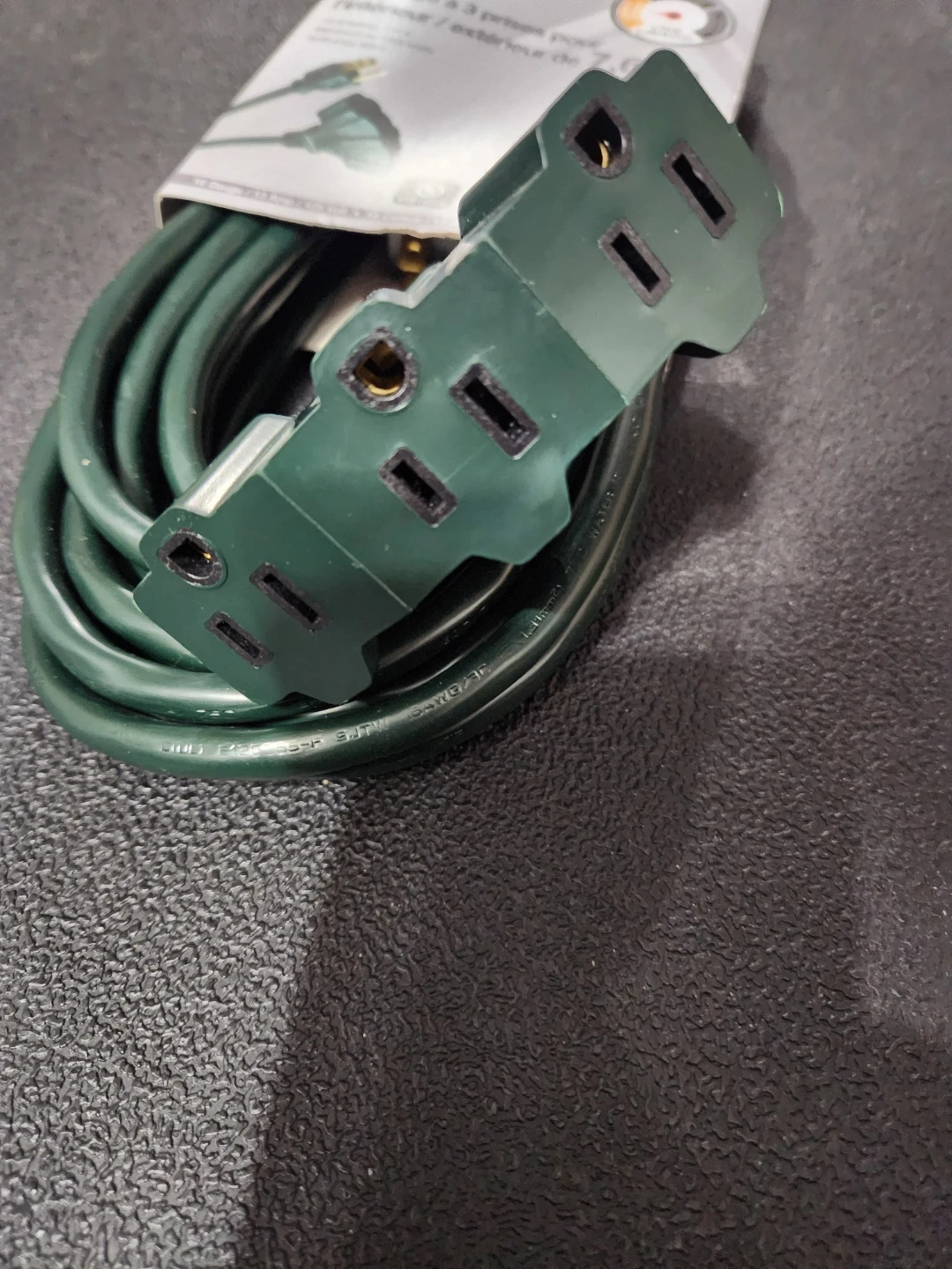 Selling a HDX 25 ft indoor/outdoor tri-tap extension cord. It is 13 Amp, 125 V, and 1625 maximum watts. Rated for 300V.