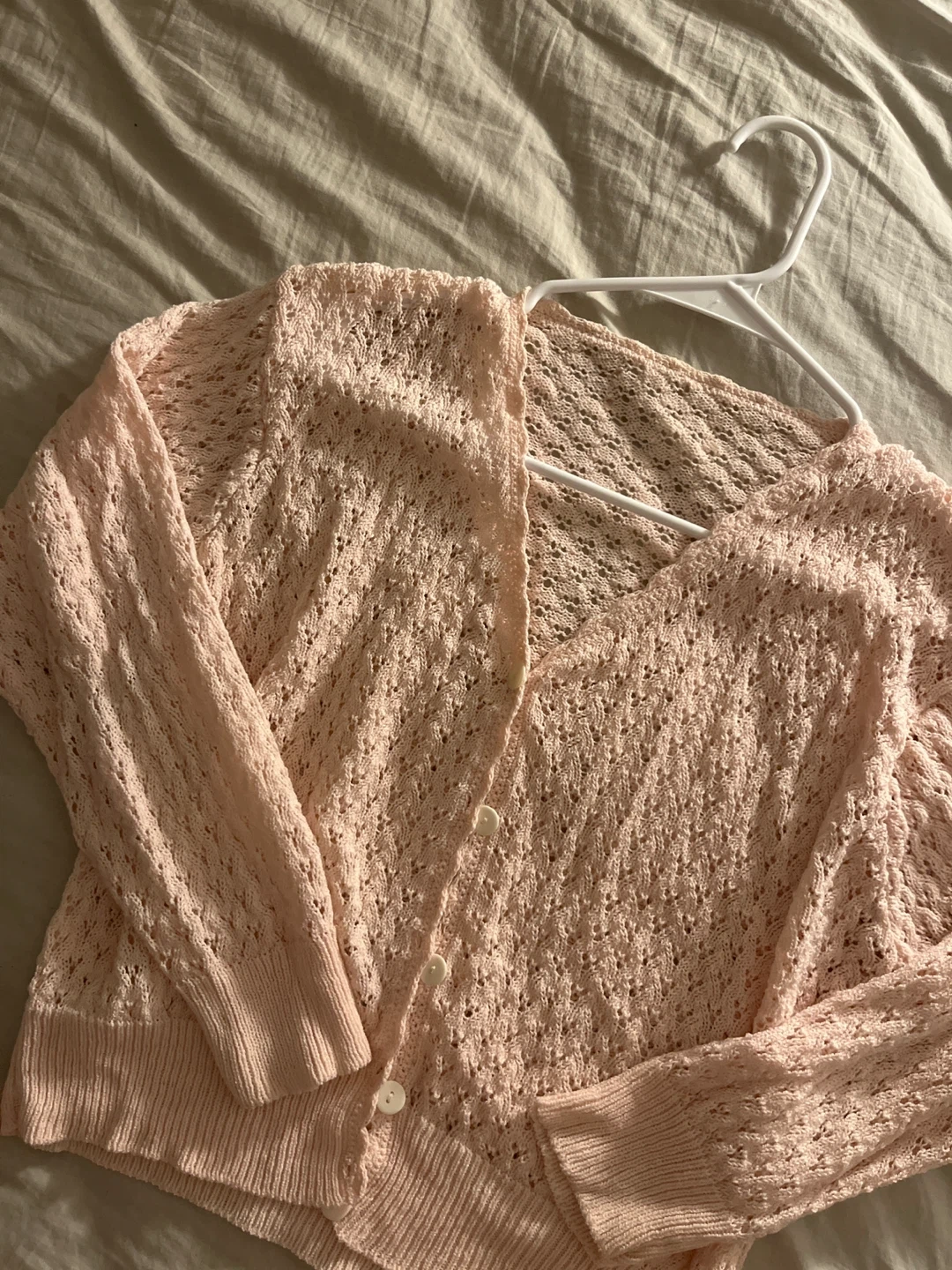 Light pink crocheted button-up cardigan with a delicate open-knit pattern. Features a V-neckline and ribbed cuffs and hem. A soft, breathable layer for warmer days.