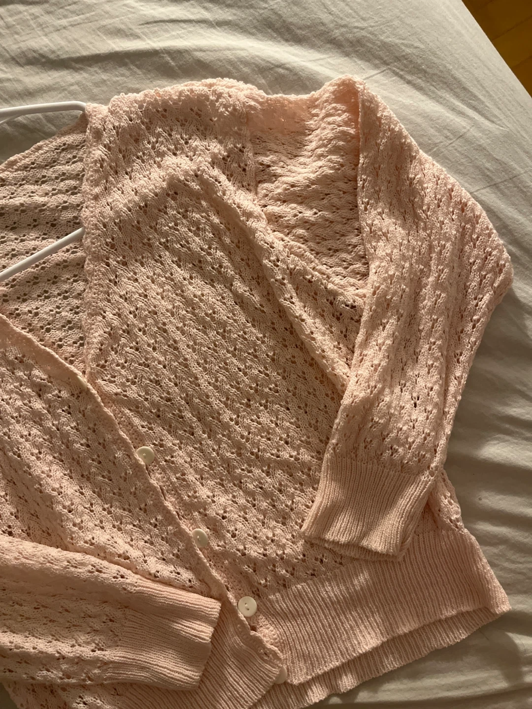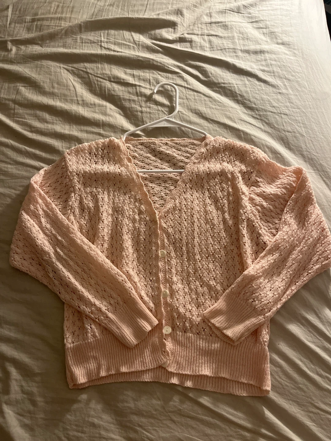 Light pink crocheted button-up cardigan with a delicate open-knit pattern. Features a V-neckline and ribbed cuffs and hem. A soft, breathable layer for warmer days.