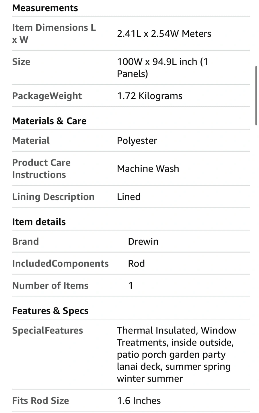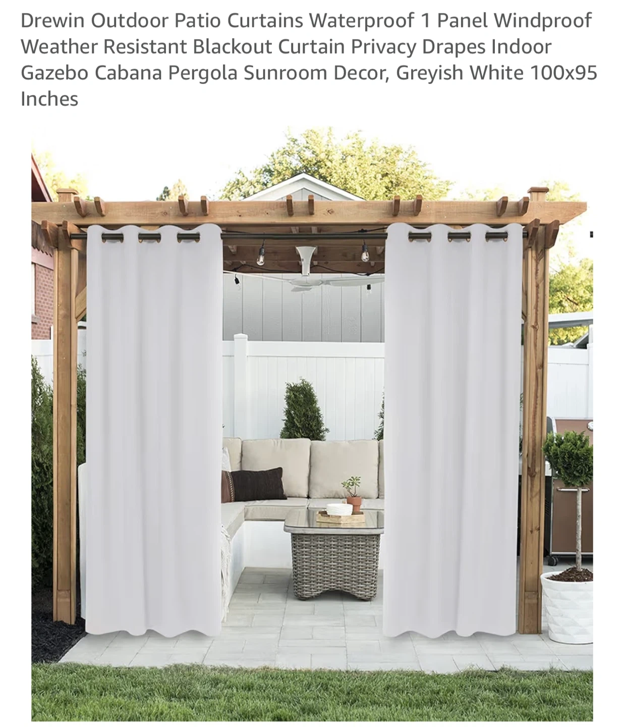 These Drewin outdoor patio curtains are waterproof and windproof. They're made of polyester material and are machine washable. One panel is included, measuring 100 inches wide by 95 inches long.