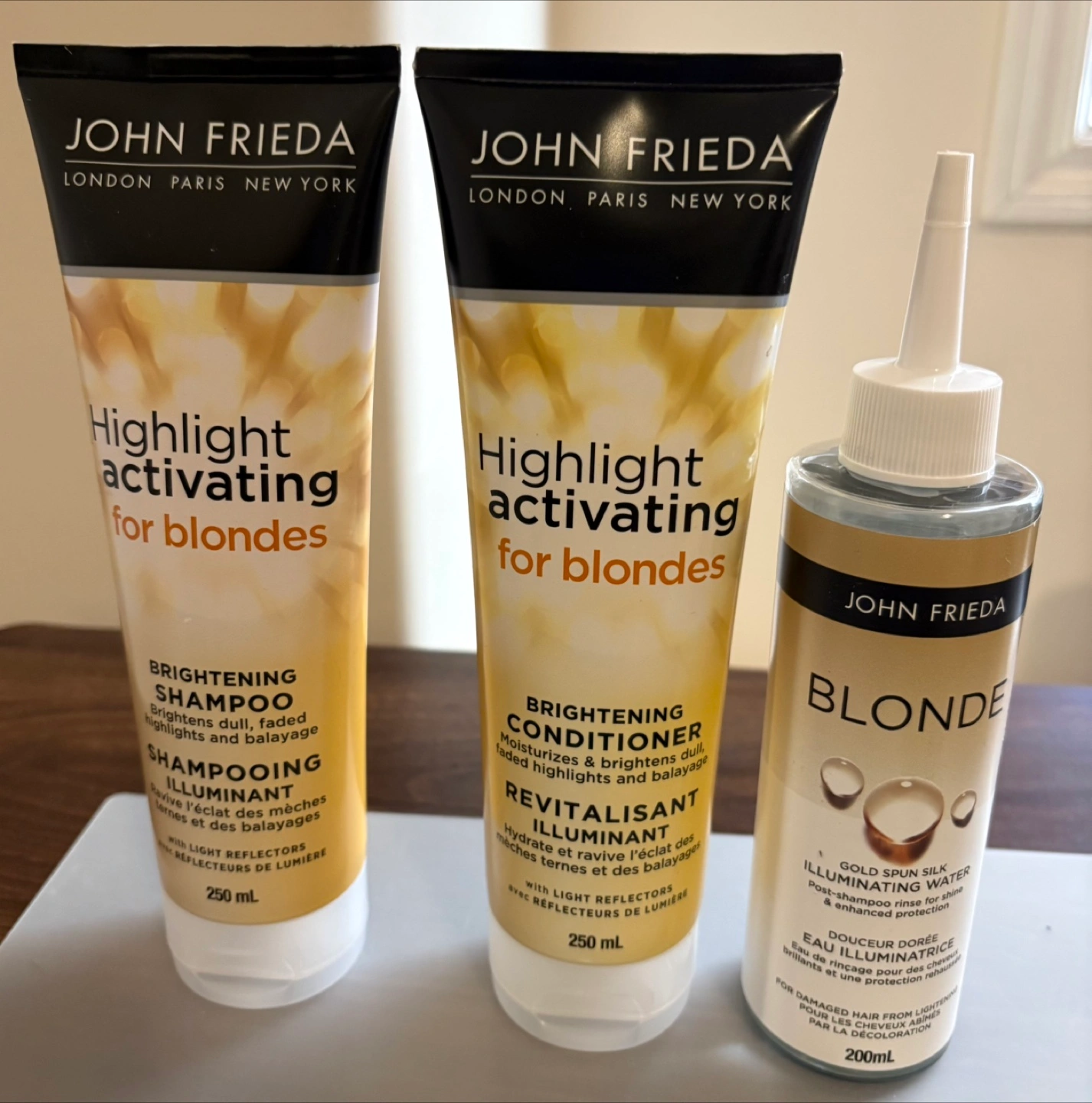 John Frieda Highlight Activating Shampoo and Conditioner for blondes. Brightening formulas. Includes illuminating water for shine and protection. 250ml bottles of shampoo and conditioner, 200ml bottle of illuminating water.
