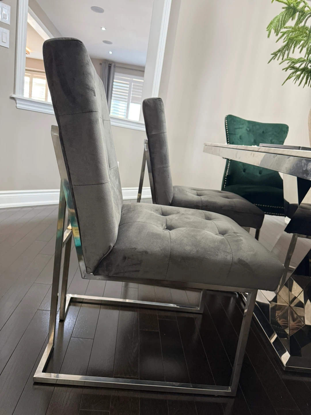 These four dining chairs feature a soft grey velvet upholstery and 2 green accent chairs. They're built with sturdy chrome legs .