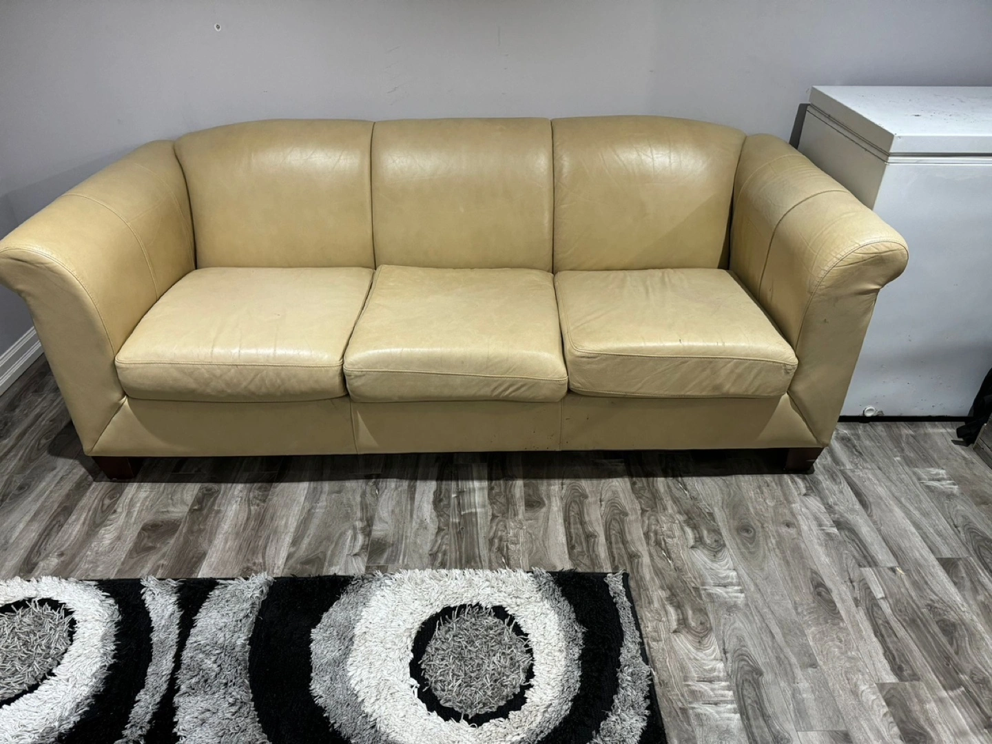 Three-seater sofa with a beige leather cover. Has some wear and tear, but is still in good condition. Ask for address it’s free on porch for pick up