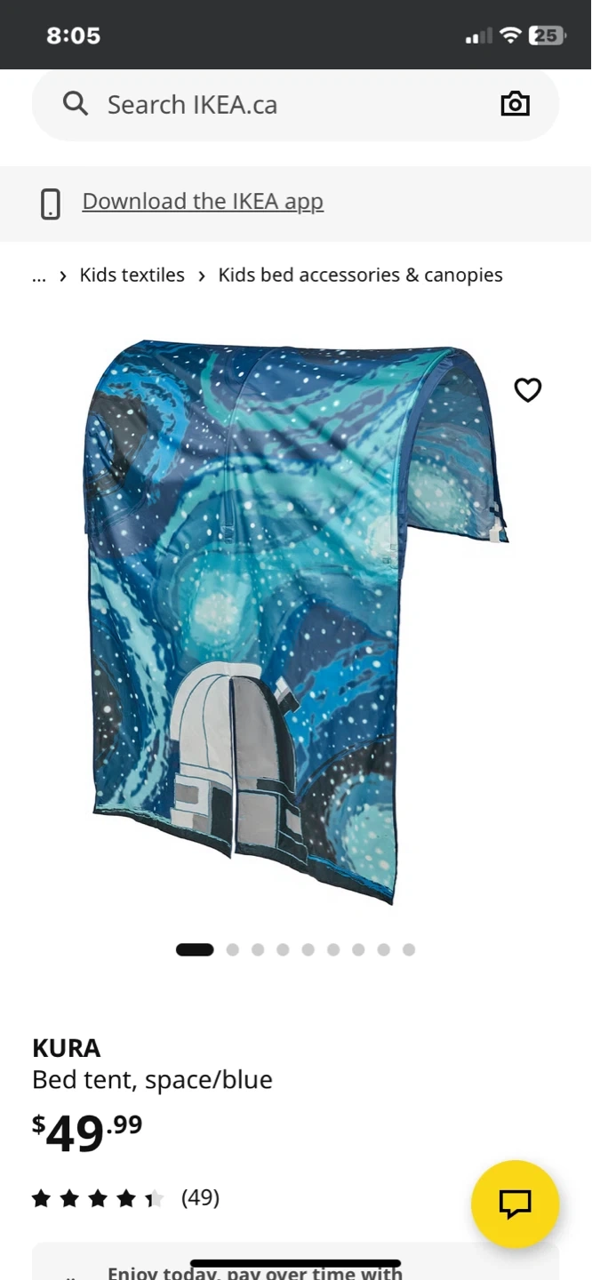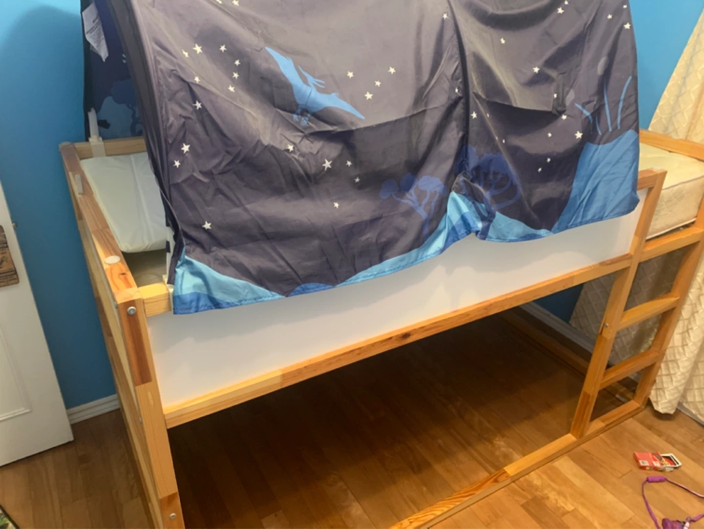 This IKEA KURA bed tent has a fun space and blue starry night design. It fits over the KURA bed frame and creates a cool fort. Kids will love having their own private space to play in really good condition almost new.