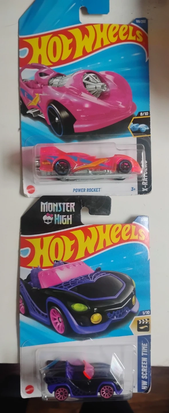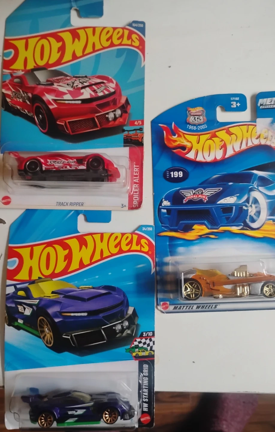 🏆 Four Hot Wheels toy cars, including 'Track Ripper', 'Power Rocket', 'HW Starting Grid', and 'NW Screen Time'. These die-cast vehicles come in their original packaging.