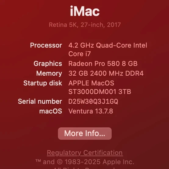 Selling my 2017 Apple iMac, a powerhouse of performance and style, featuring a vibrant 27-inch Retina 5K display, a 4.2 GHz Quad-Core Intel Core i7 processor, 32 GB of memory, and a 3TB Fusion Drive. It is running the latest macOS Ventura 13.7.8, this iMac is perfect for creative professionals or anyone who appreciates high-quality computing. The condition is good, with some signs of wear but fully functional. Own a piece of Apple's legacy without breaking the bank!