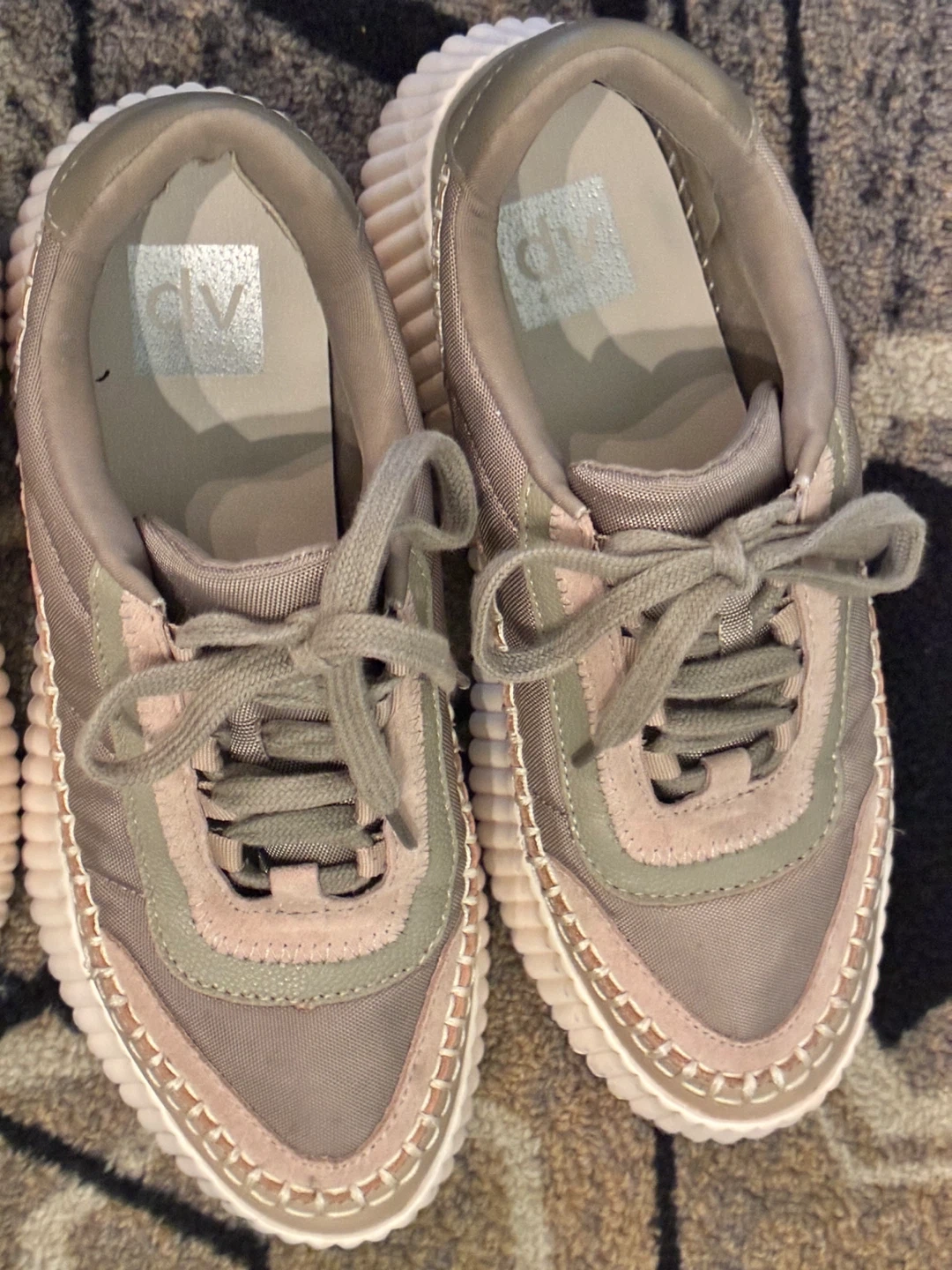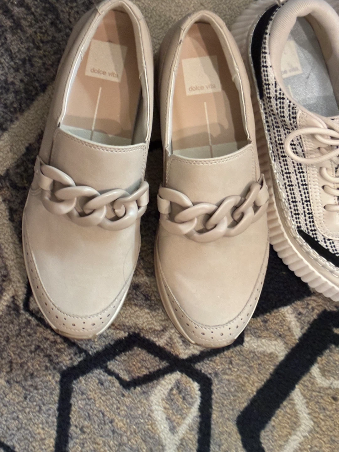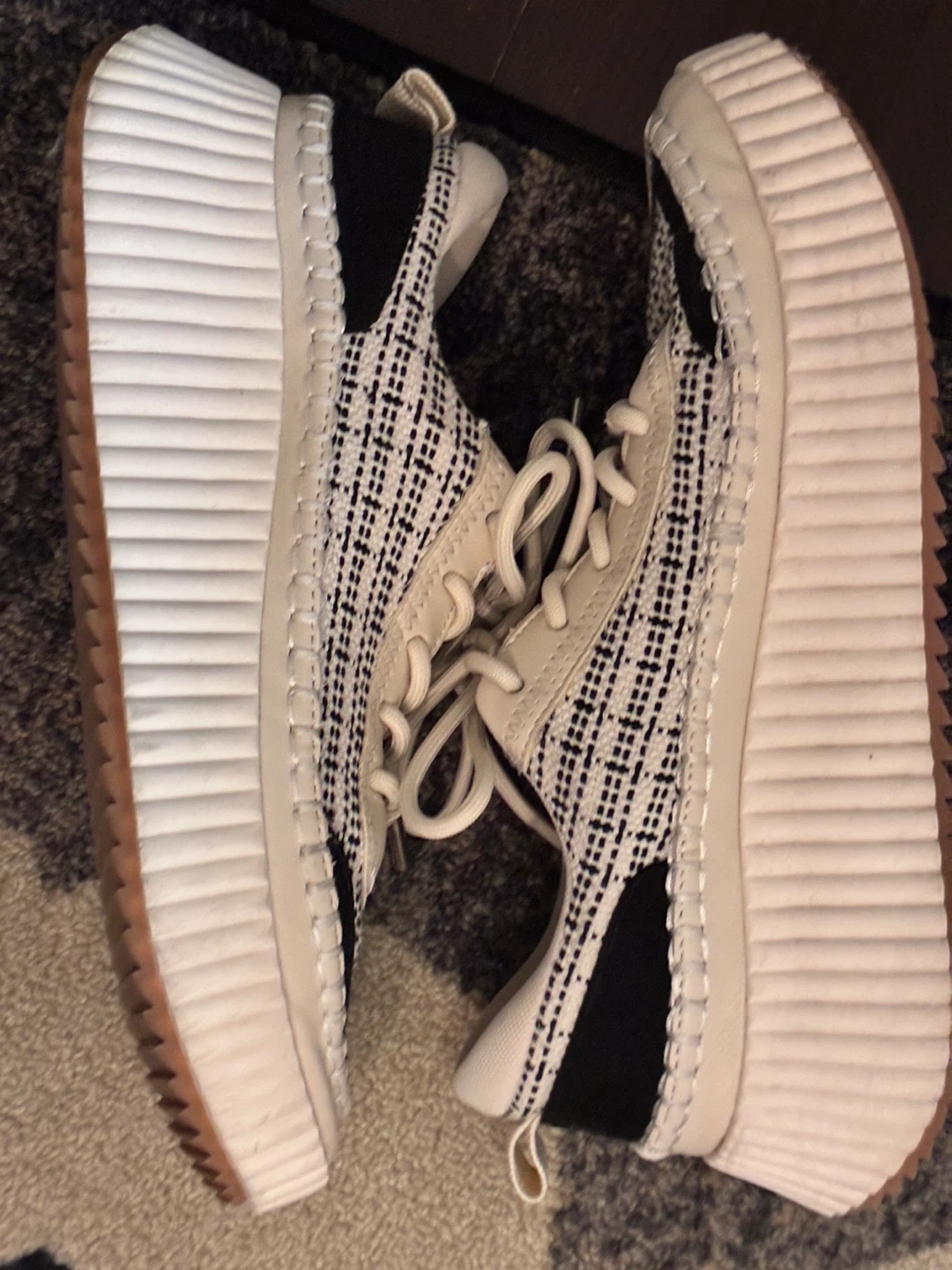 These Dolce Vita sneakers are super comfy and stylish. They feature a unique tweed-like pattern with cream and black accents and a chunky sole. Perfect for everyday wear!
