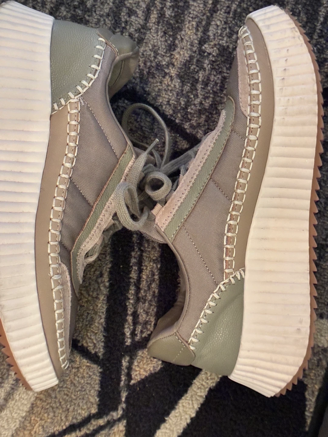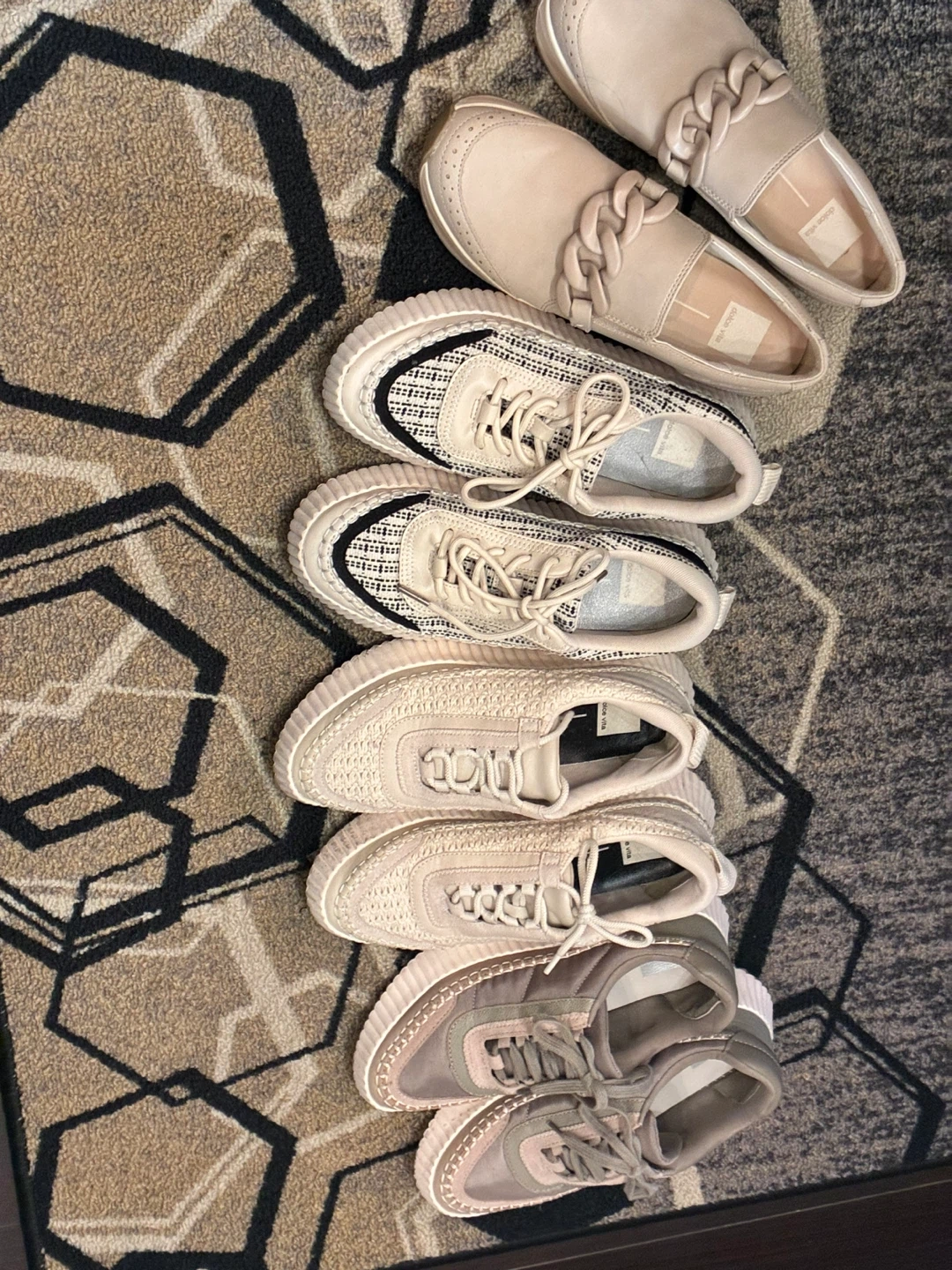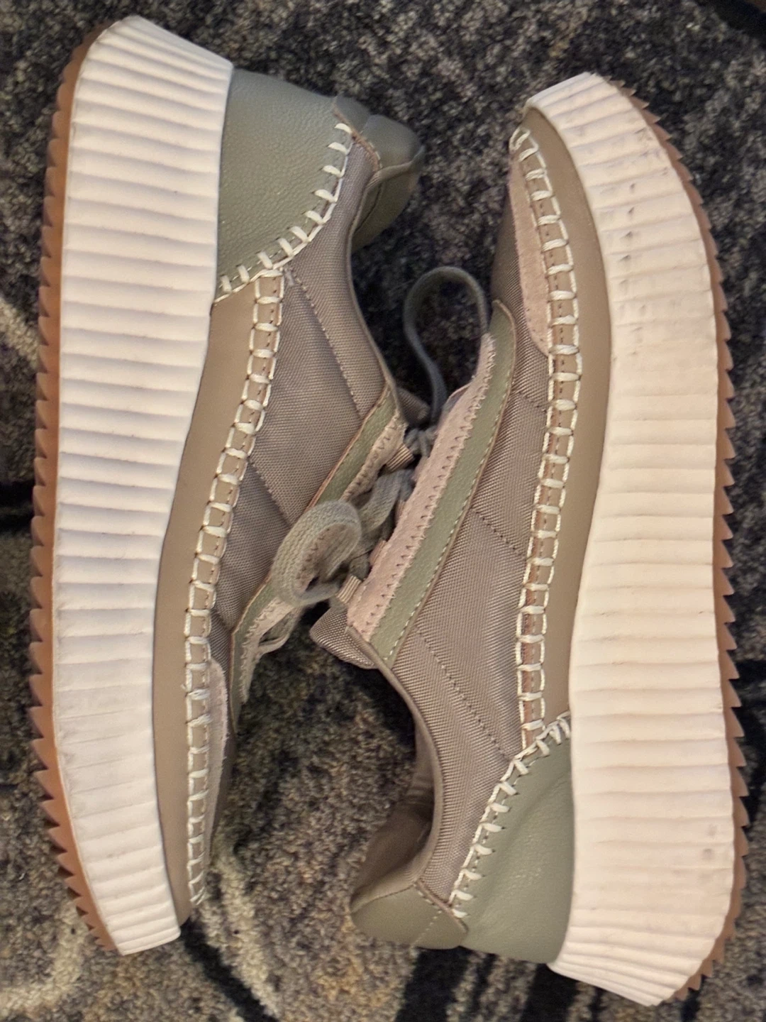 These Dolce Vita sneakers are super comfy and stylish. They feature a unique tweed-like pattern with cream and black accents and a chunky sole. Perfect for everyday wear!