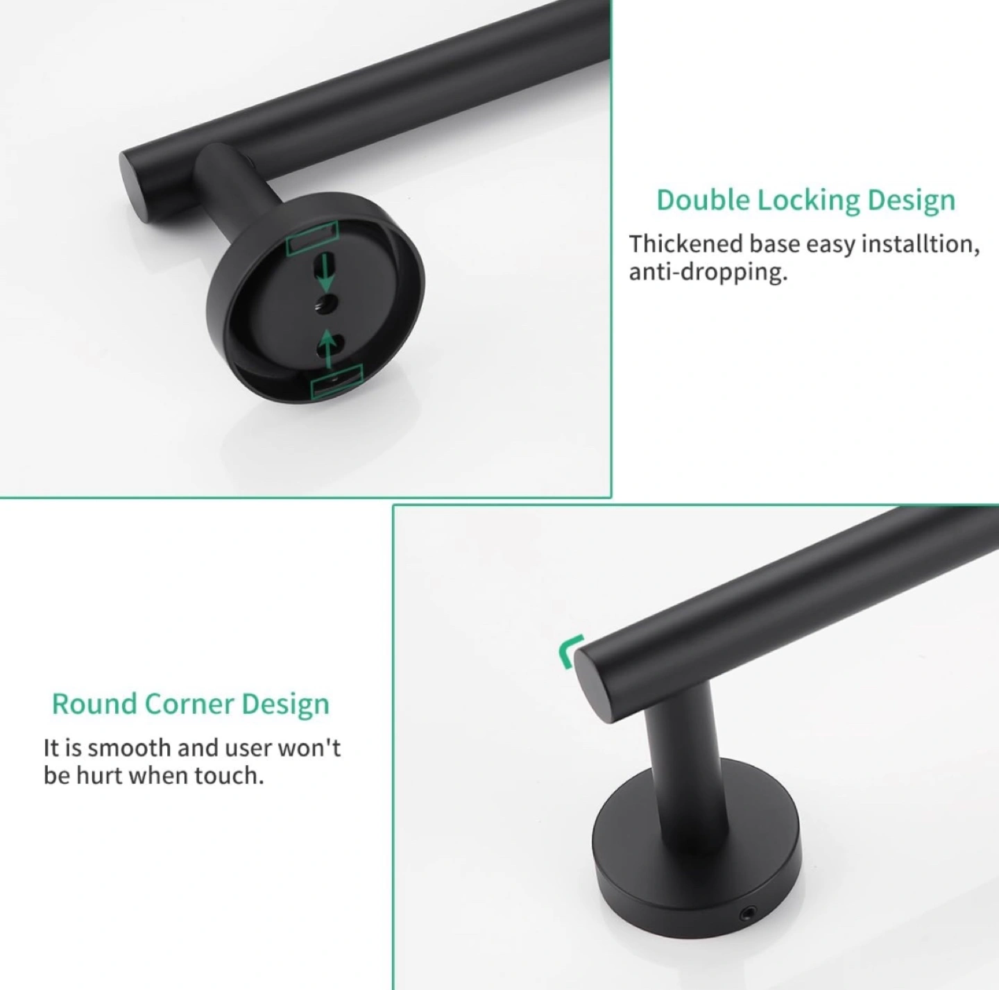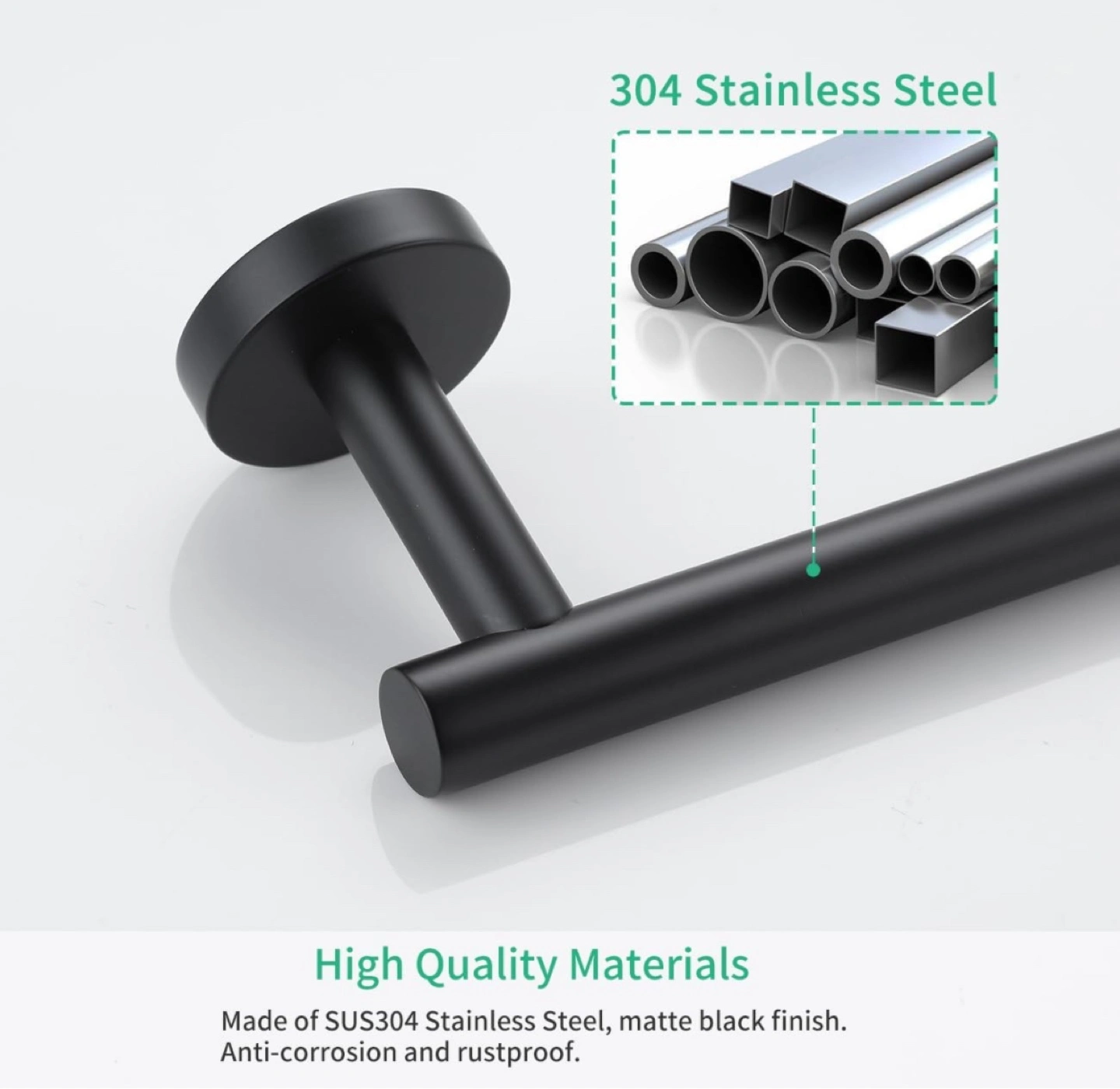 Bathroom towel bar. Durable 304 stainless steel construction. Matte black finish. Easy installation. Round corners for safety. Anti-corrosion and rustproof.