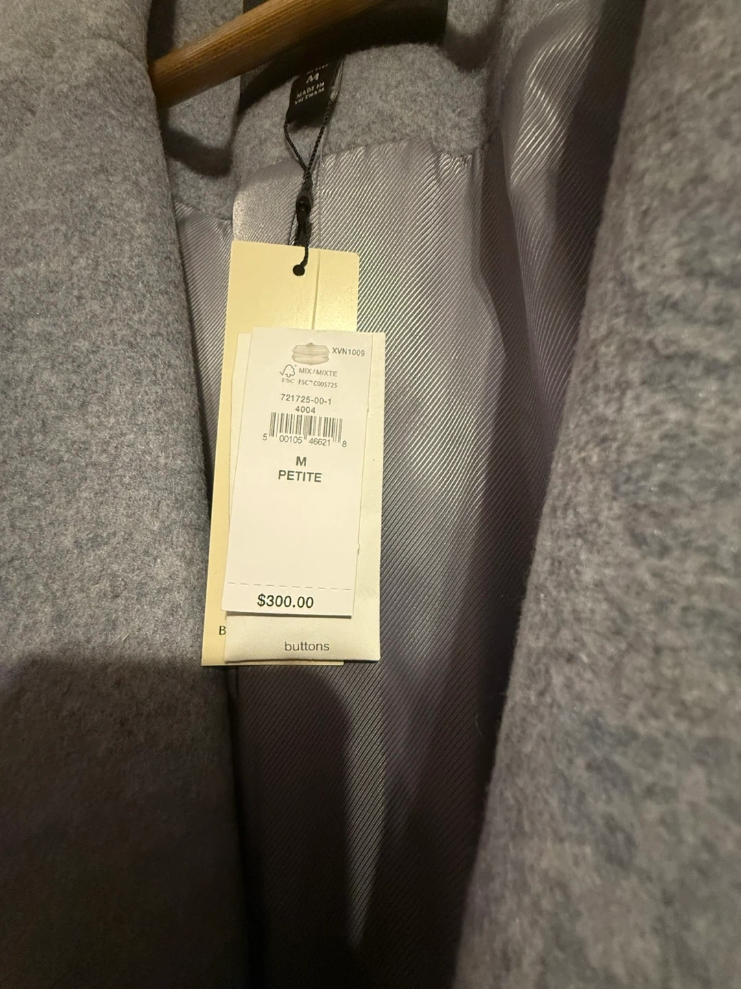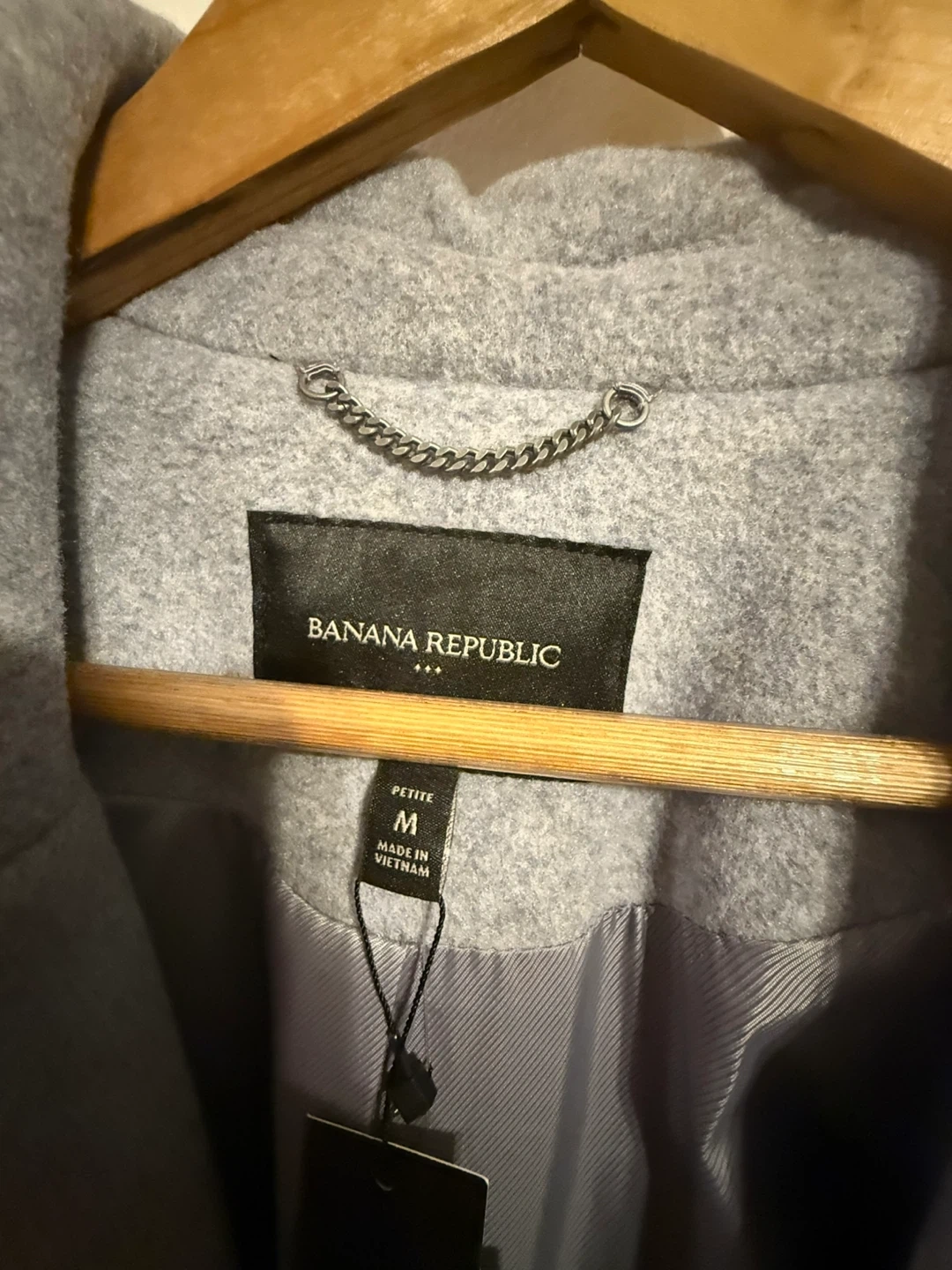 This is a Banana Republic coat in a lovely gray color! It's a wool blend and a size M Petite. The coat is NEW and ready for a new home. Originally bought for $300!