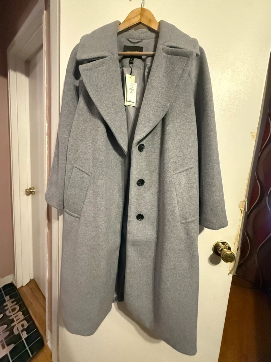 This is a Banana Republic coat in a lovely gray color! It's a wool blend and a size M Petite. The coat is NEW and ready for a new home. Originally bought for $300!