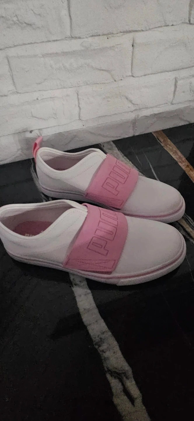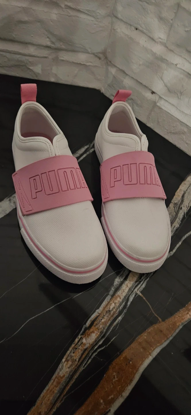 These Puma slip-on shoes are white with pink accents. They're a women's size 8 Features elasticated PUMA band across the top. Pull tab at the heel for easy on and off.