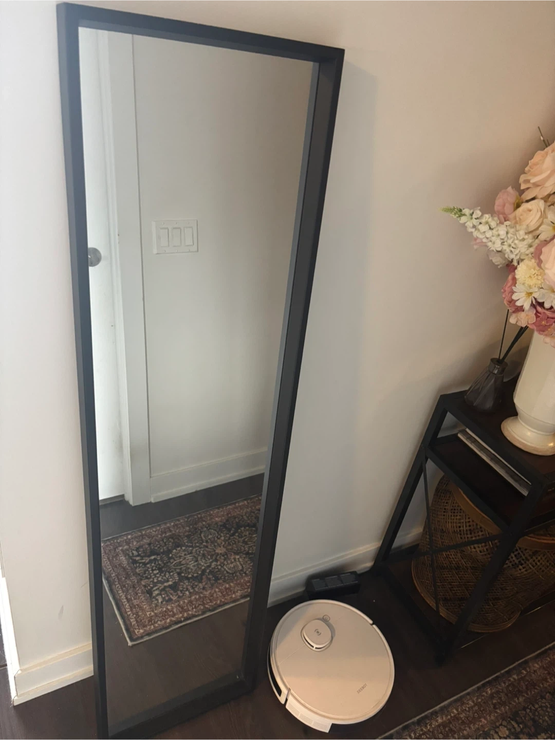 A tall, black-framed full-length mirror is perfect for checking your outfit before heading out. Its simple design complements any room's decor. Adds a touch of elegance to your bedroom or hallway!
