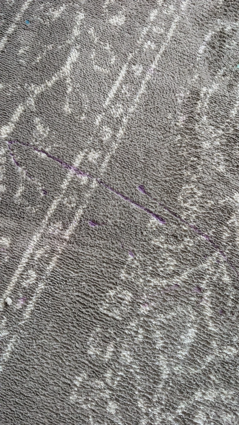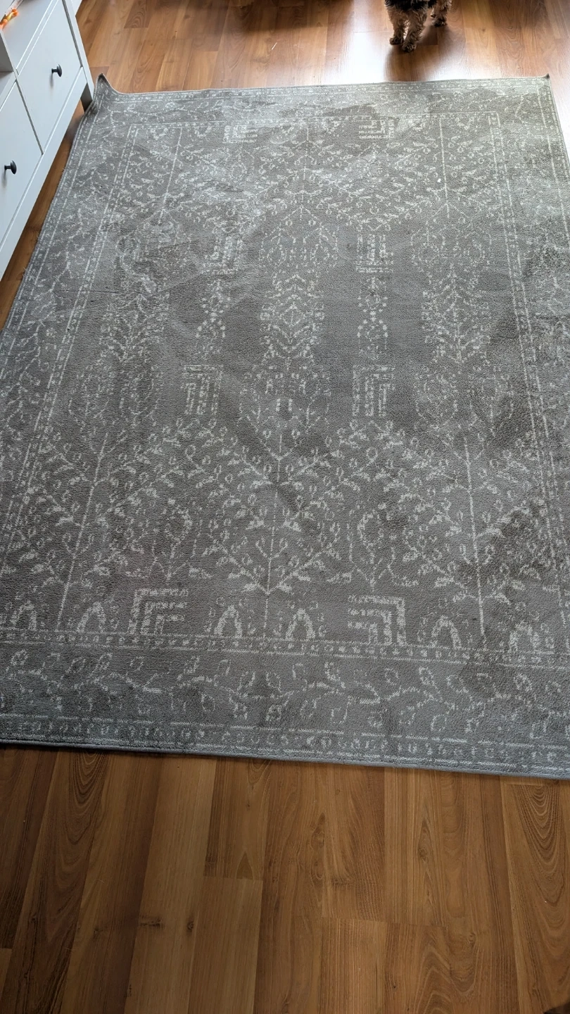 This is a grey area rug with a distressed pattern. It's soft and would add warmth to any room. Some minor stains and a small purple mark are visible on close inspection.