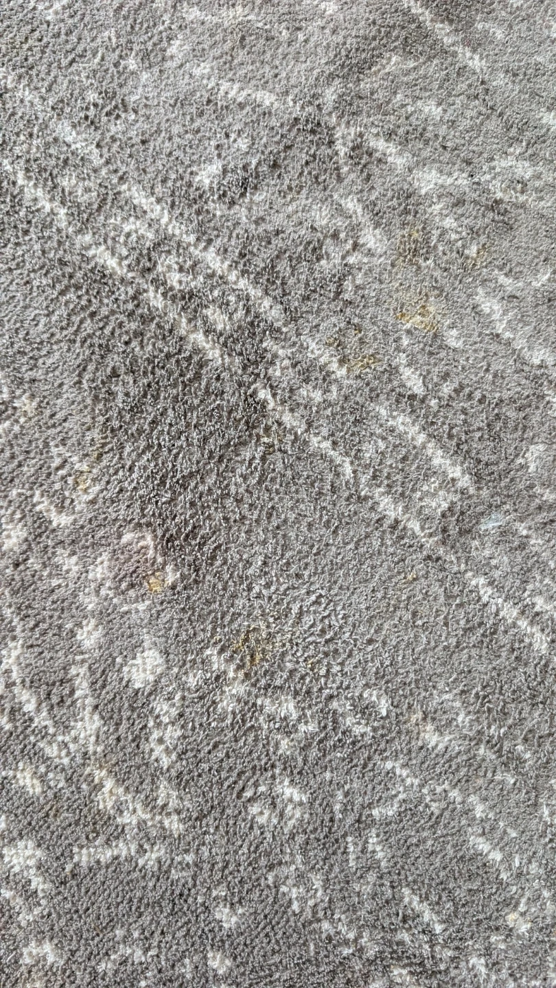 This is a grey area rug with a distressed pattern. It's soft and would add warmth to any room. Some minor stains and a small purple mark are visible on close inspection.
