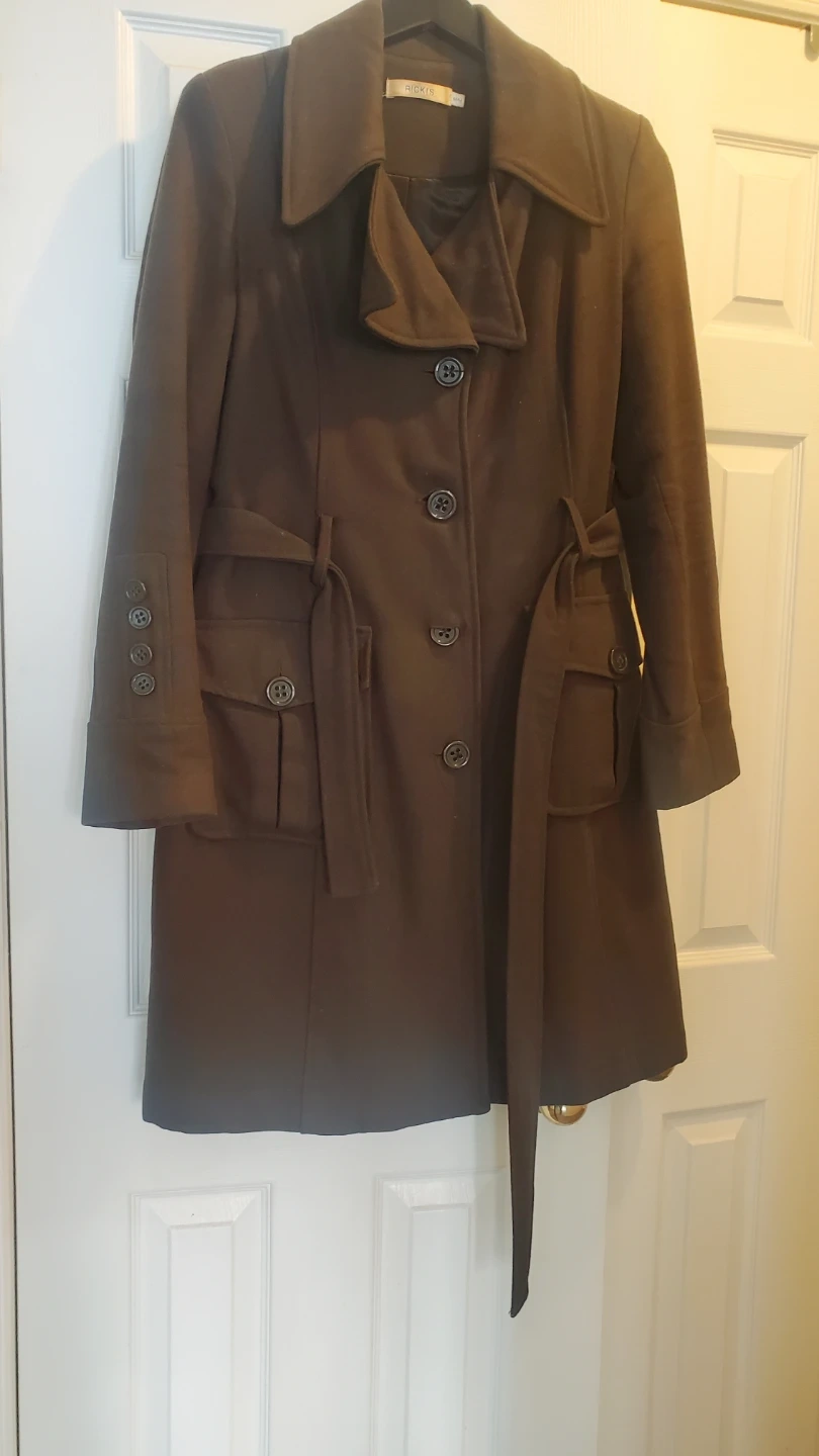 Rickis Dark Green trench coat with a double-breasted design. Features include a tie belt at the waist and buttoned pockets. Button details on the cuffs add a stylish touch.