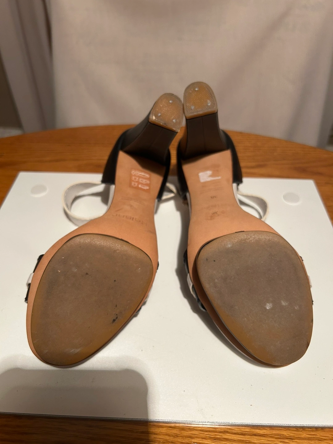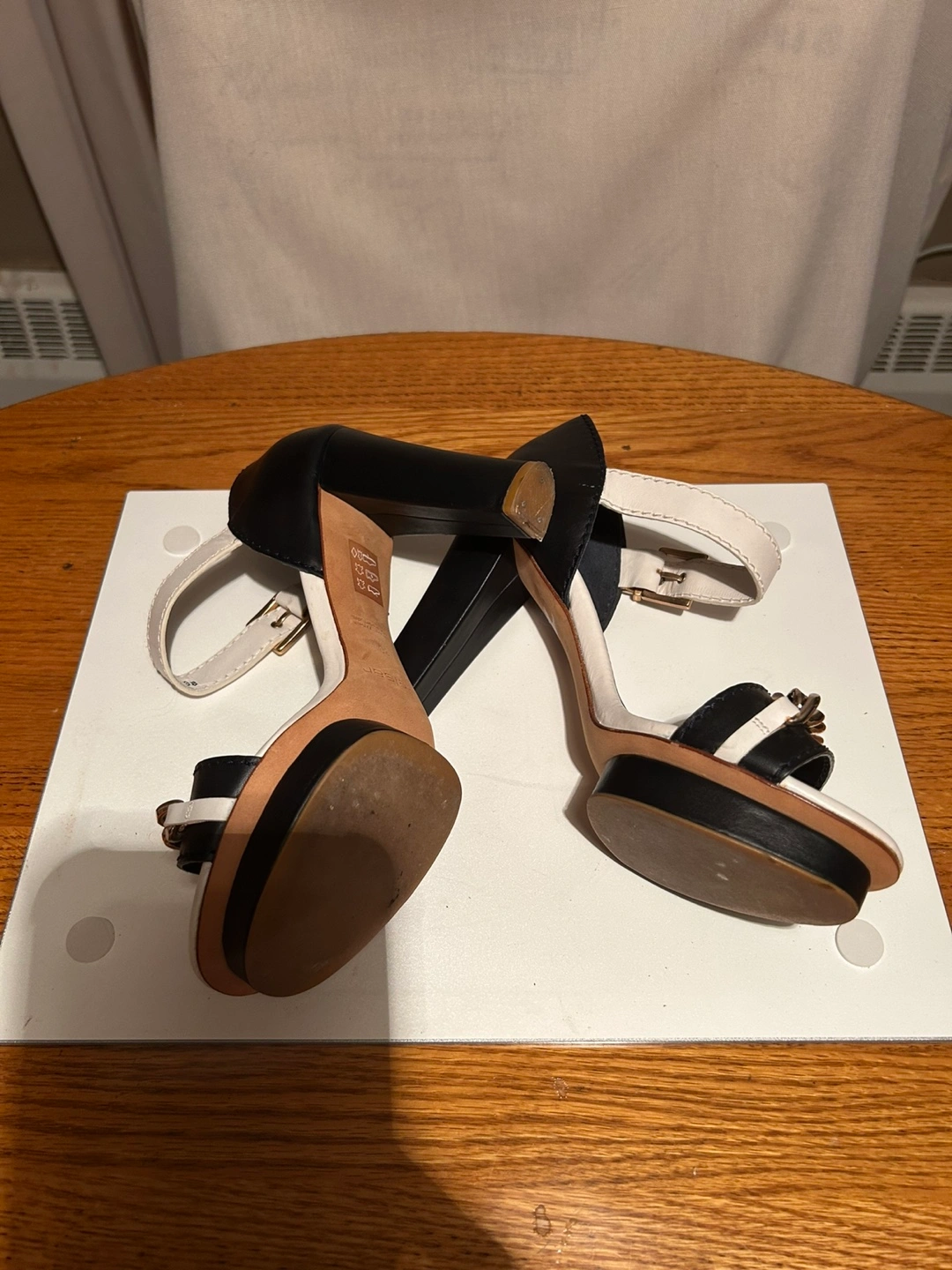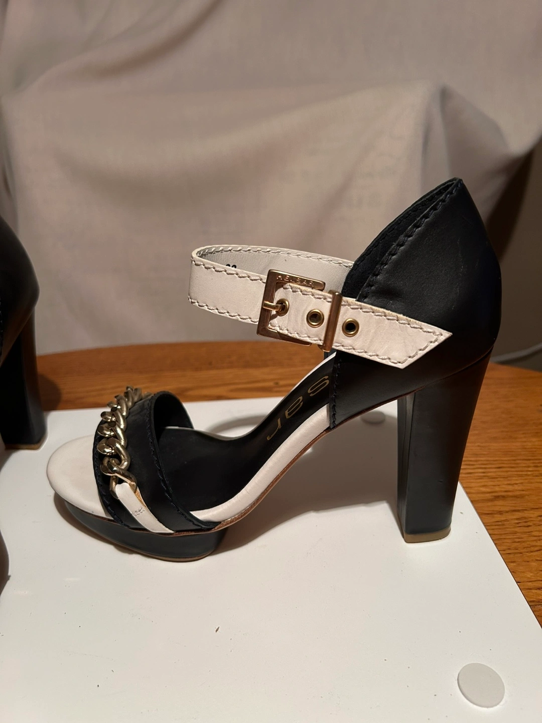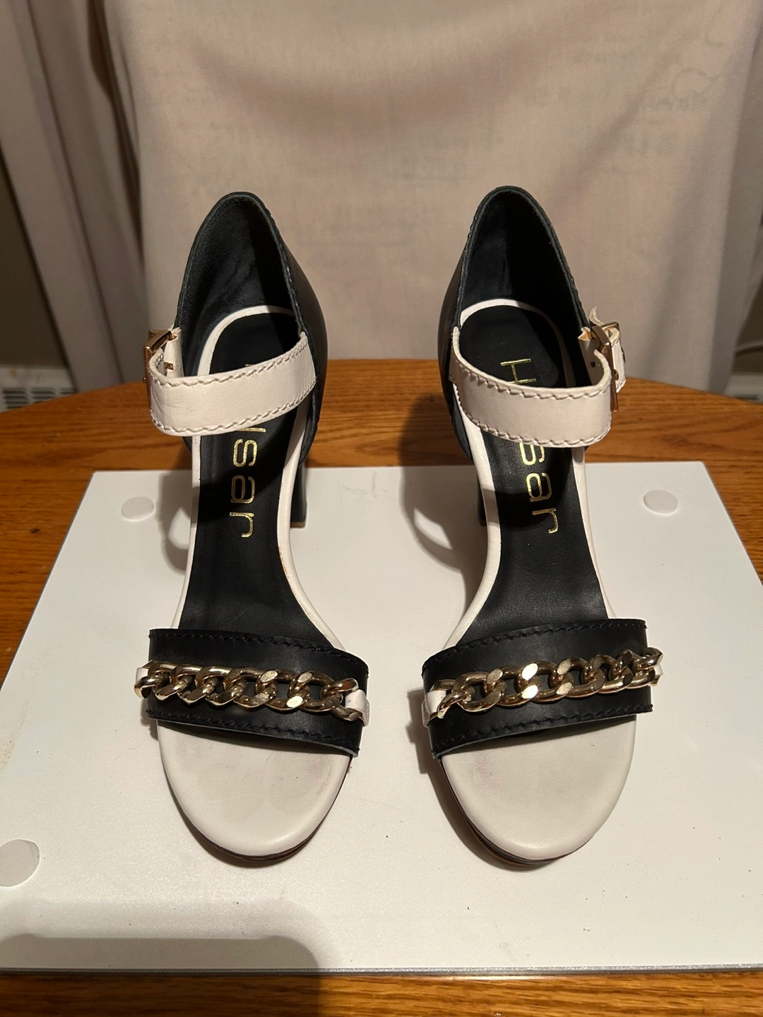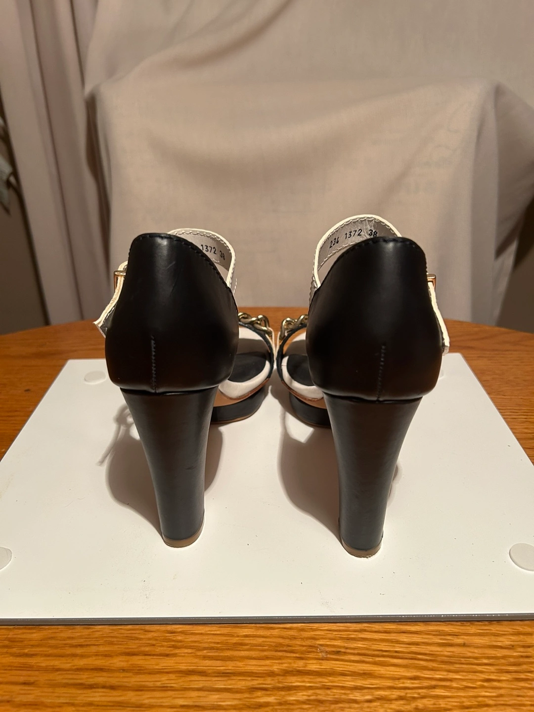 Navy blue and white platform leather heels. Ankle strap with buckle closure. Gold chain detail. Size 8. 4” heel. Leather sole. Made in Portugal.
