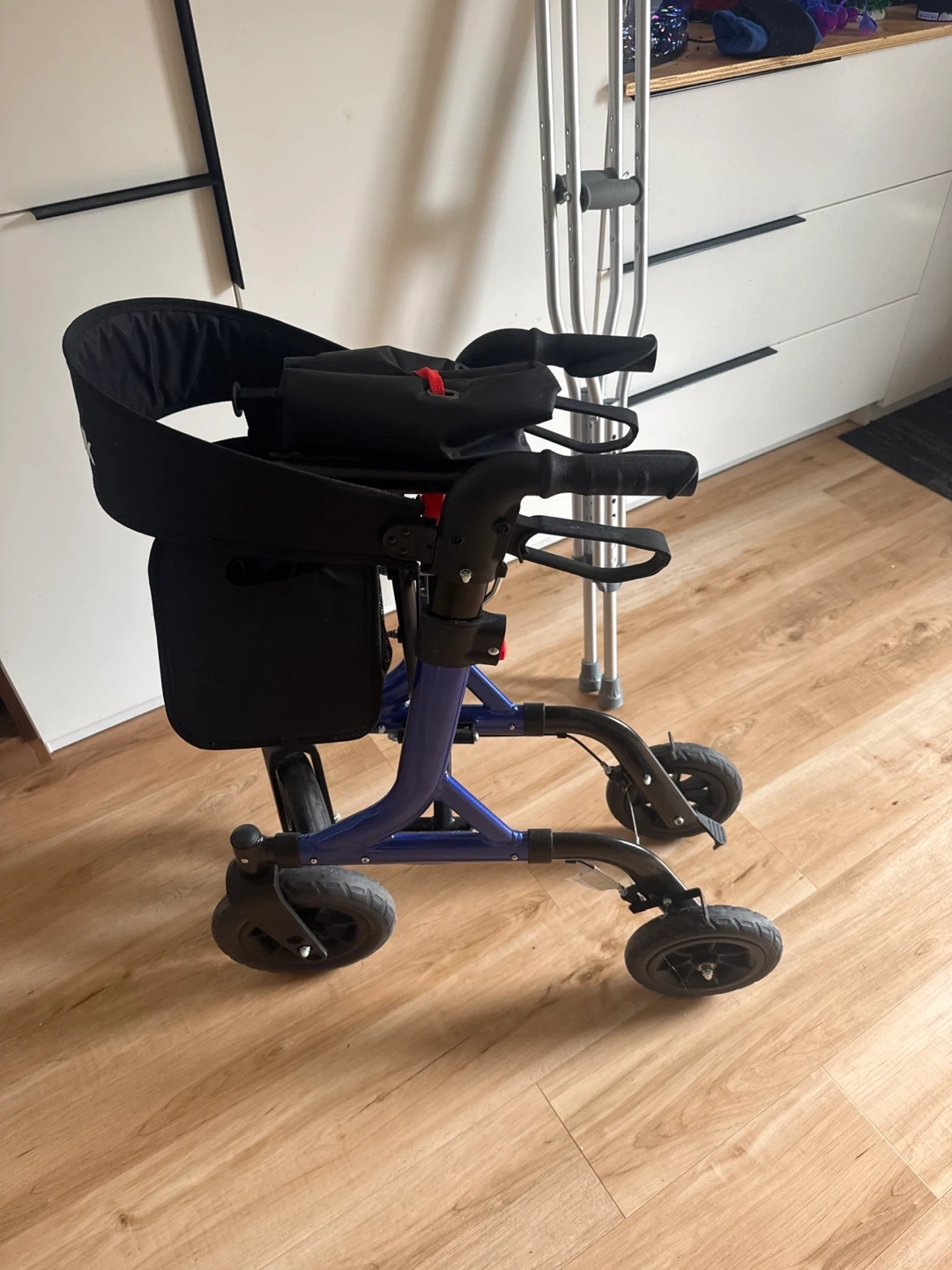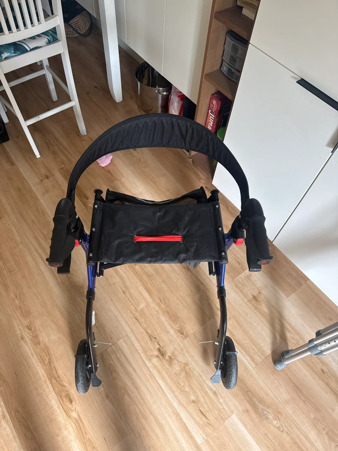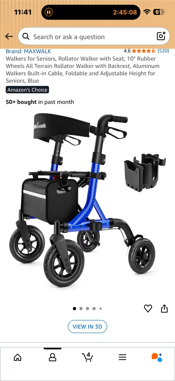 This MAXWALK rollator walker features a comfortable seat and a convenient storage bag. It's designed for seniors and offers support for mobility. Aluminum frame construction ensures durability. Adjustable height for a custom fit.