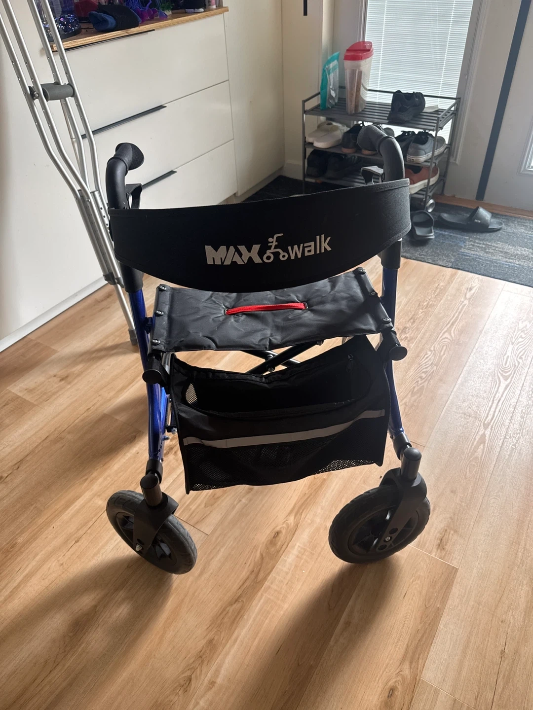 This MAXWALK rollator walker features a comfortable seat and a convenient storage bag. It's designed for seniors and offers support for mobility. Aluminum frame construction ensures durability. Adjustable height for a custom fit.