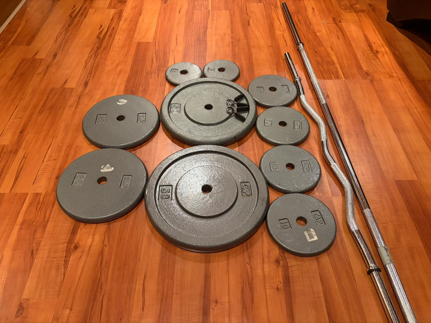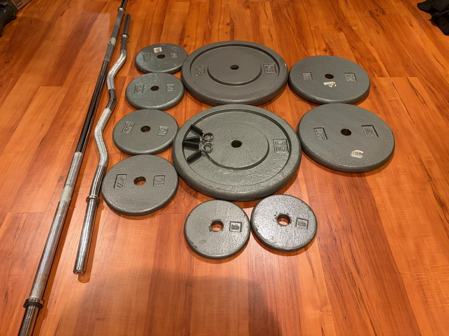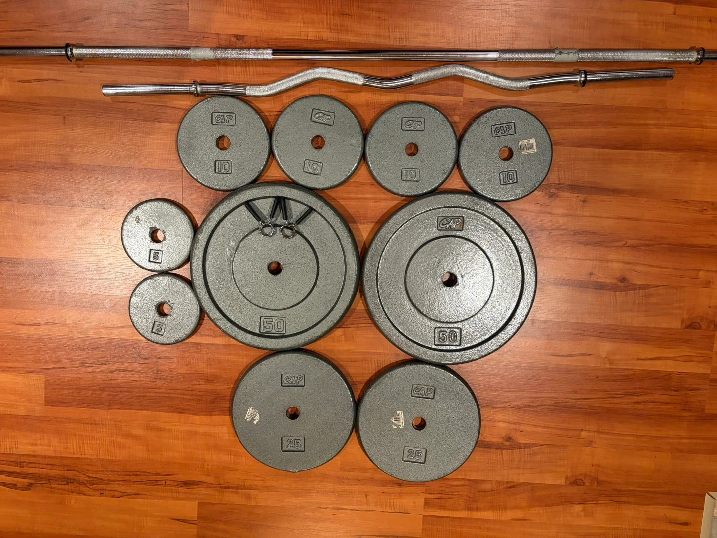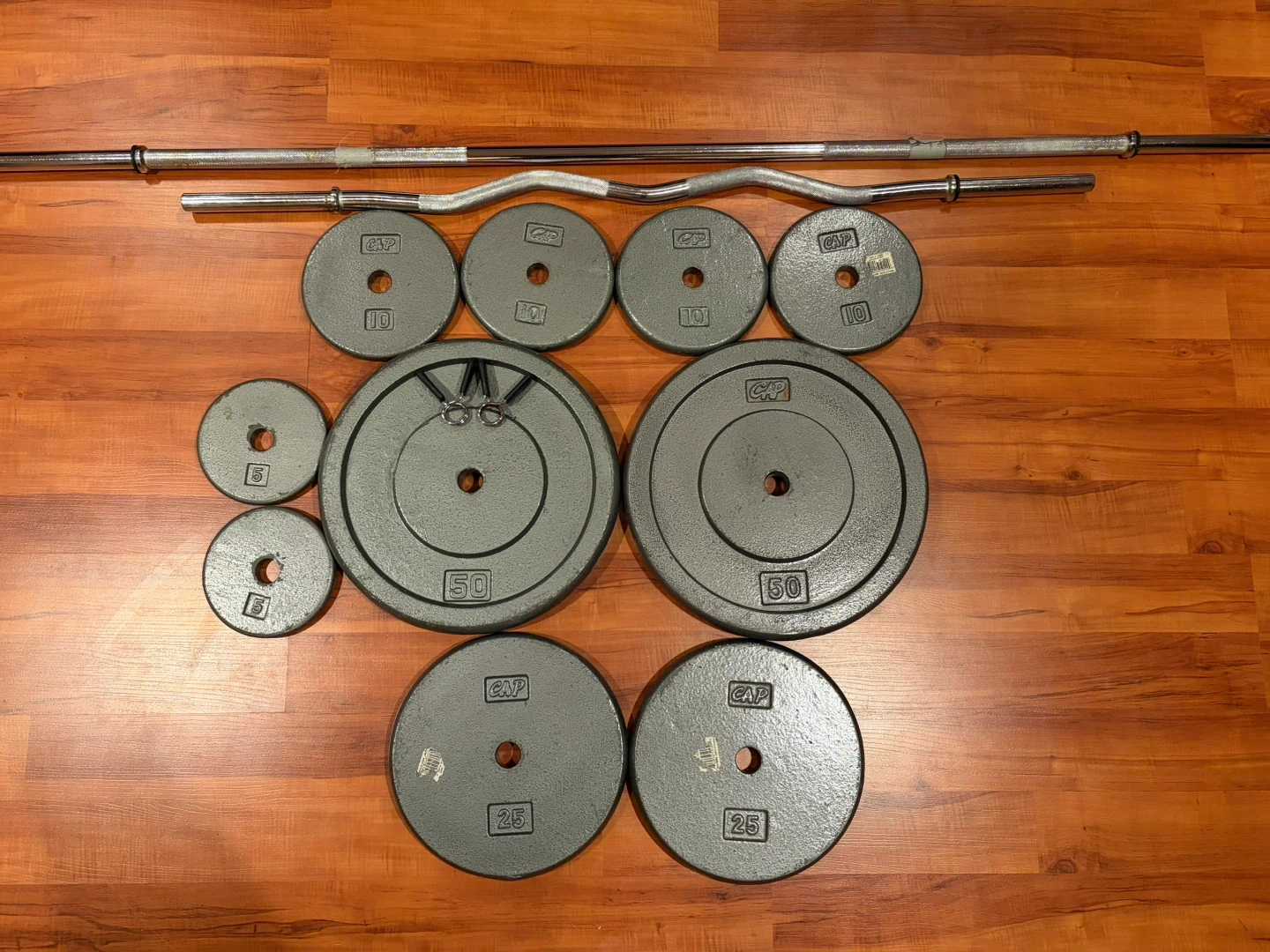 This set includes two barbells, a straight bar and an EZ curl bar. It also comes with various weight plates: two 5lb, four 10lb, two 25lb, and two 50lb plates. Two pairs of spring collars are included to secure the weights.