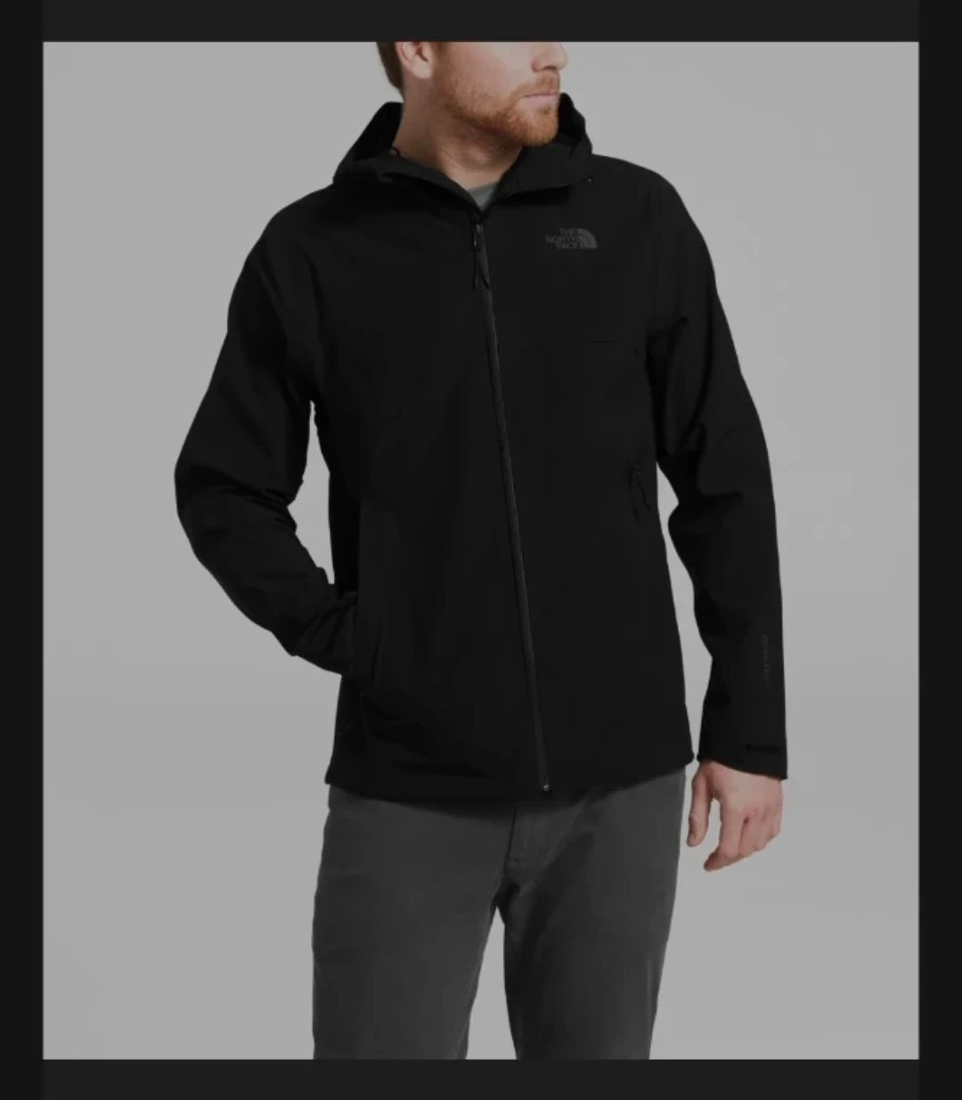 This is The North Face Apex Flex Gore-Tex jacket for men. It's designed for outdoor activities and offers waterproof protection. This jacket is black and features a full zip closure.