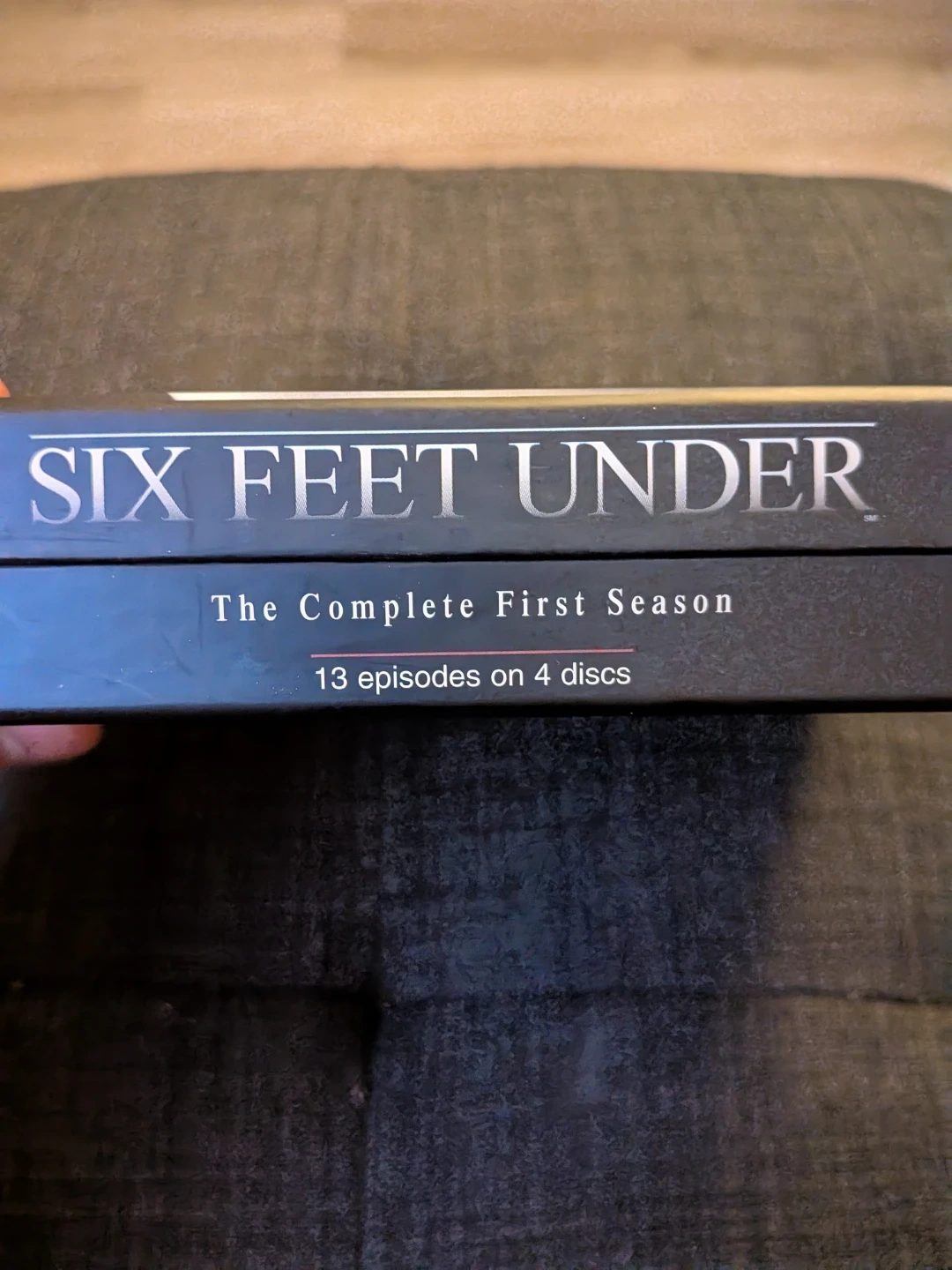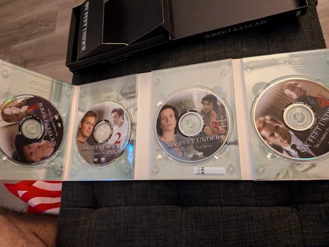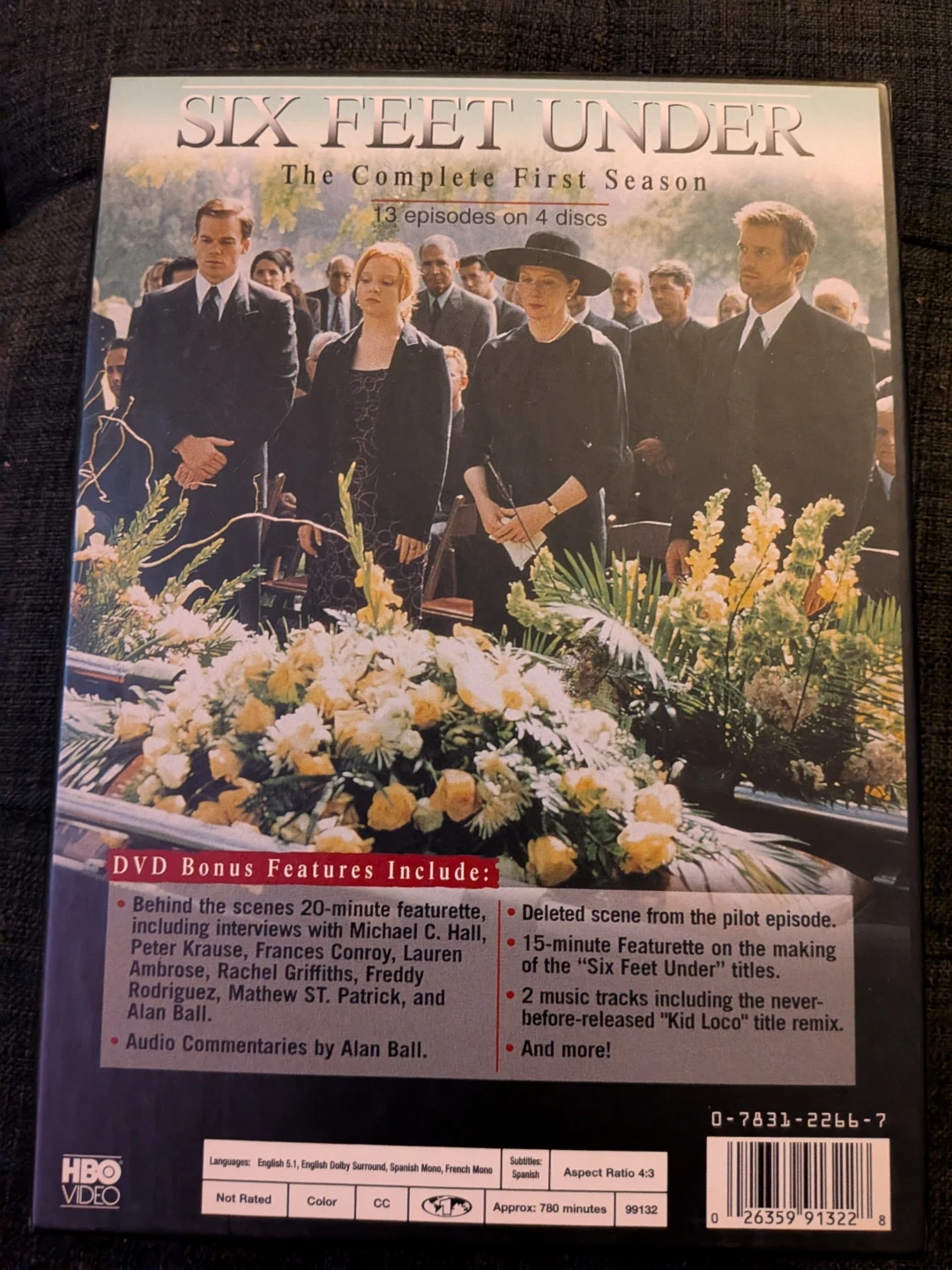 This DVD set includes Six Feet Under: The Complete First Season. It features 13 episodes across 4 discs. Bonus features like behind-the-scenes footage, deleted scenes, and audio commentaries are included.