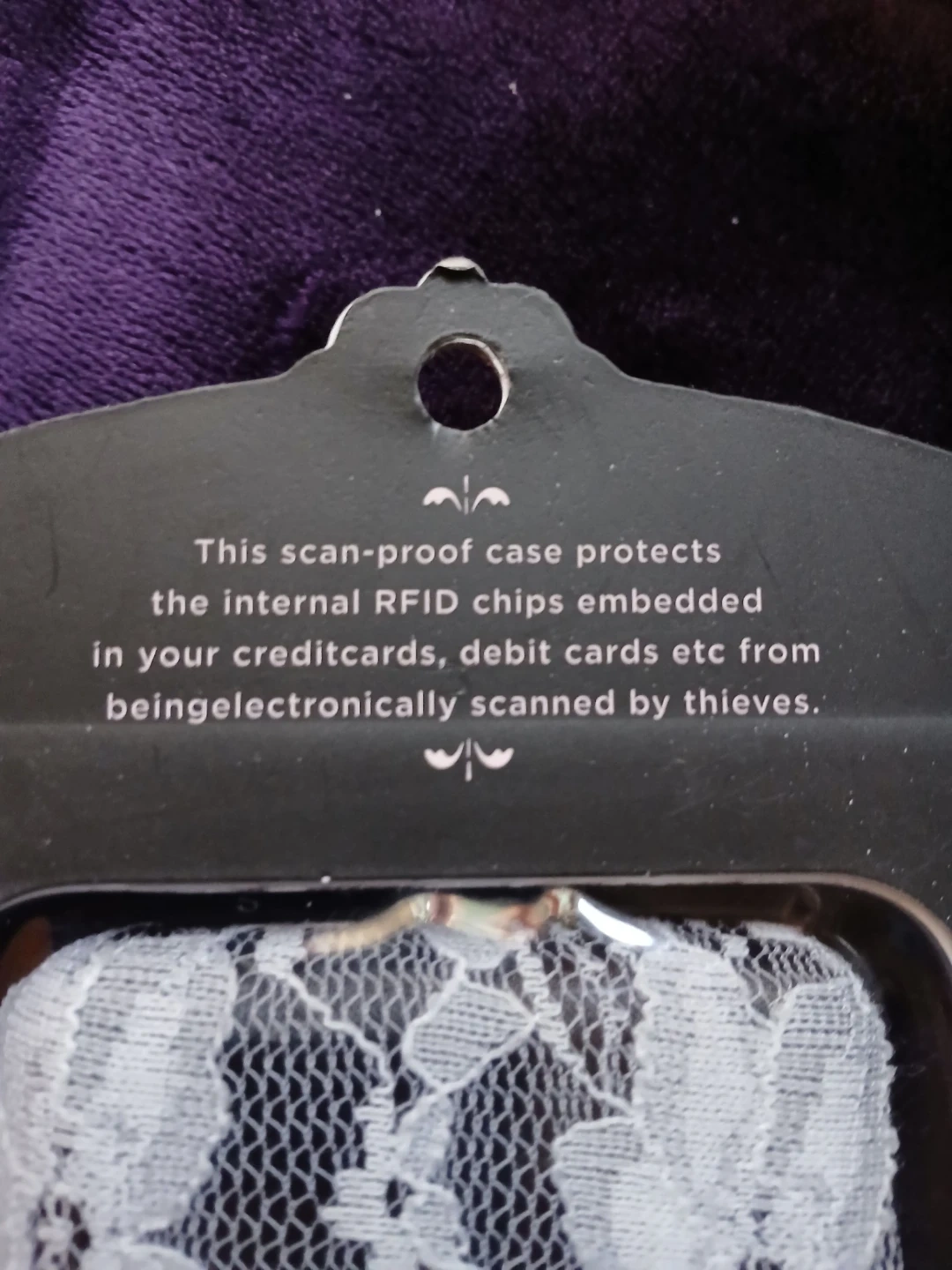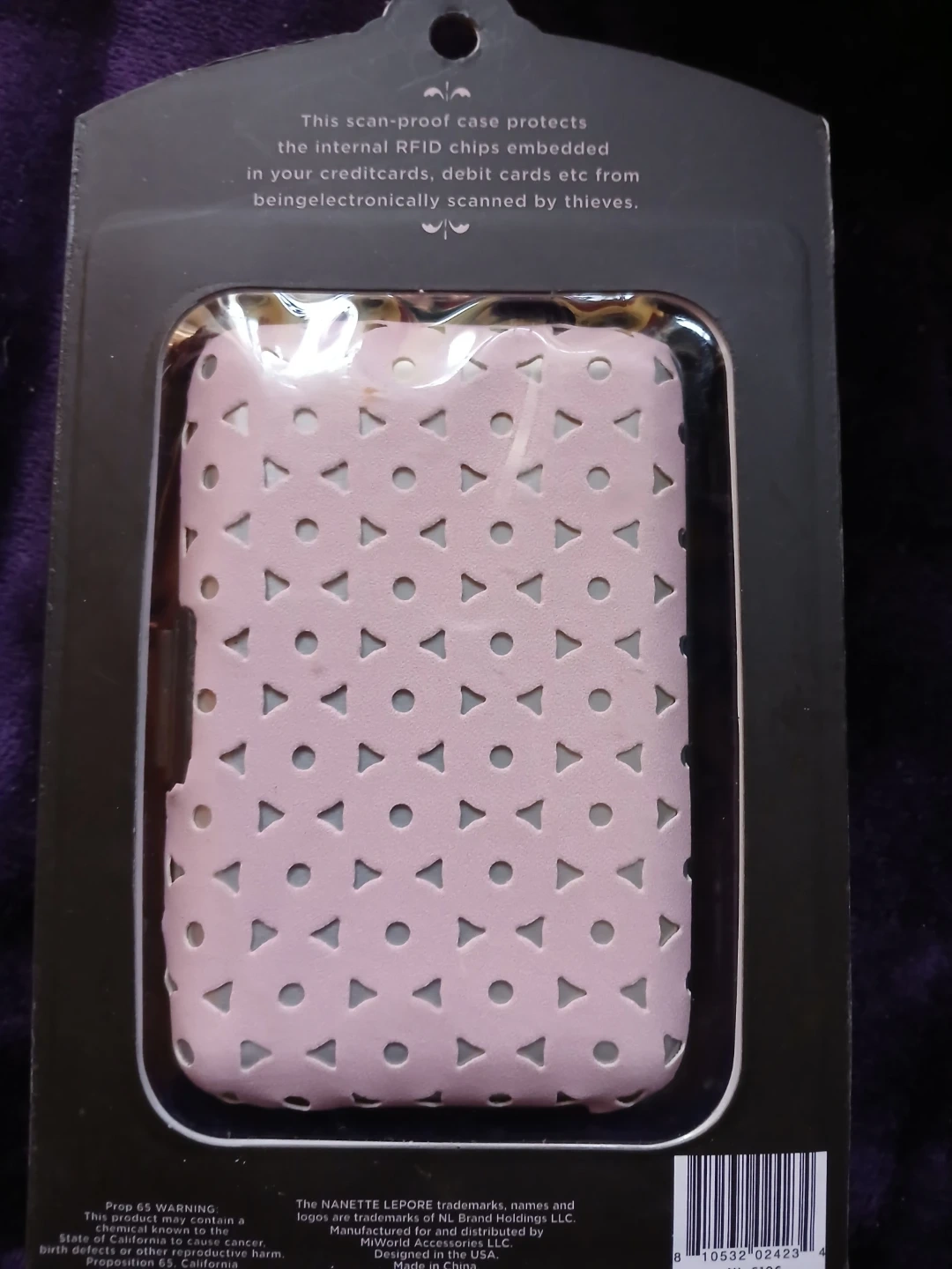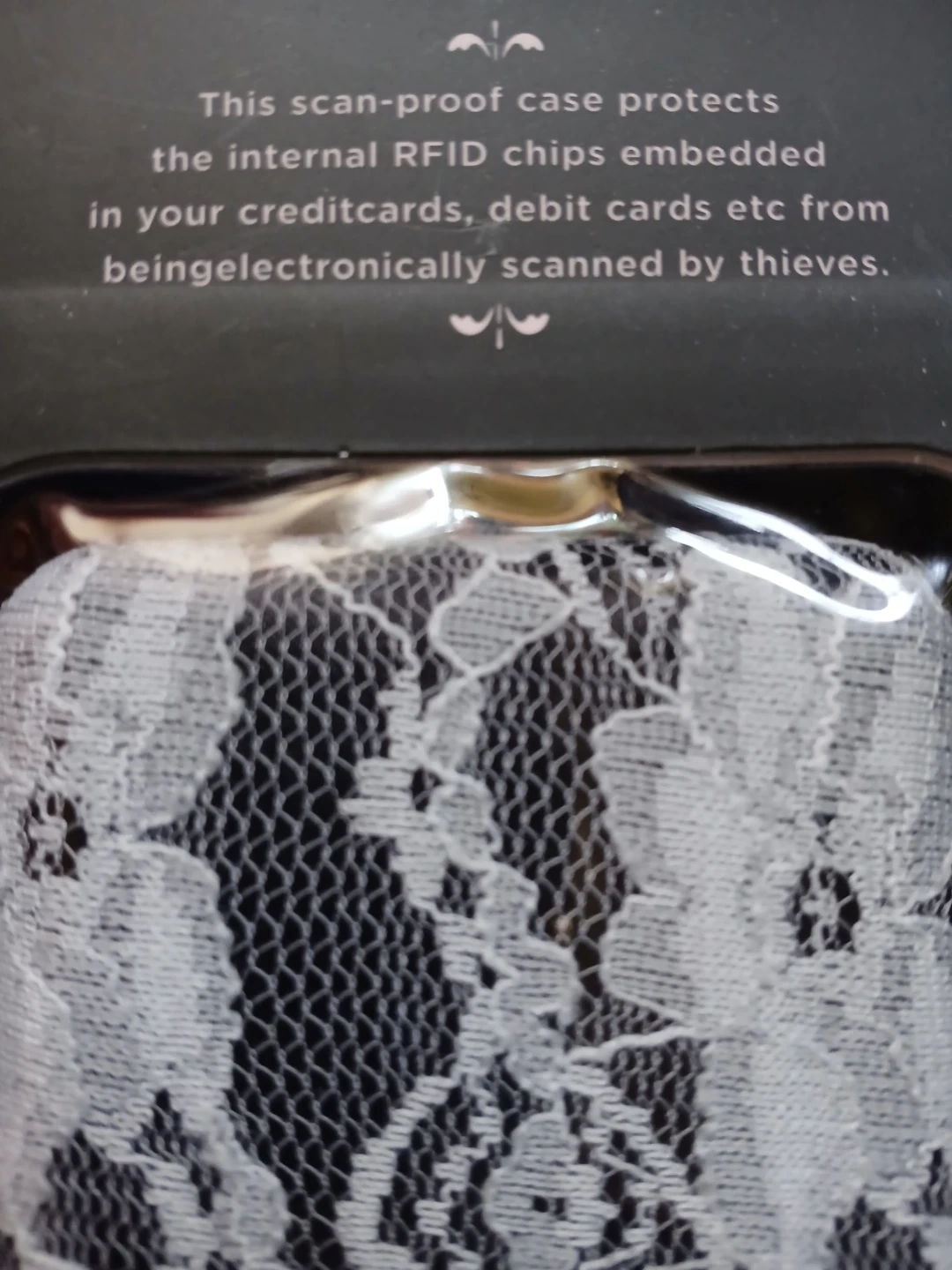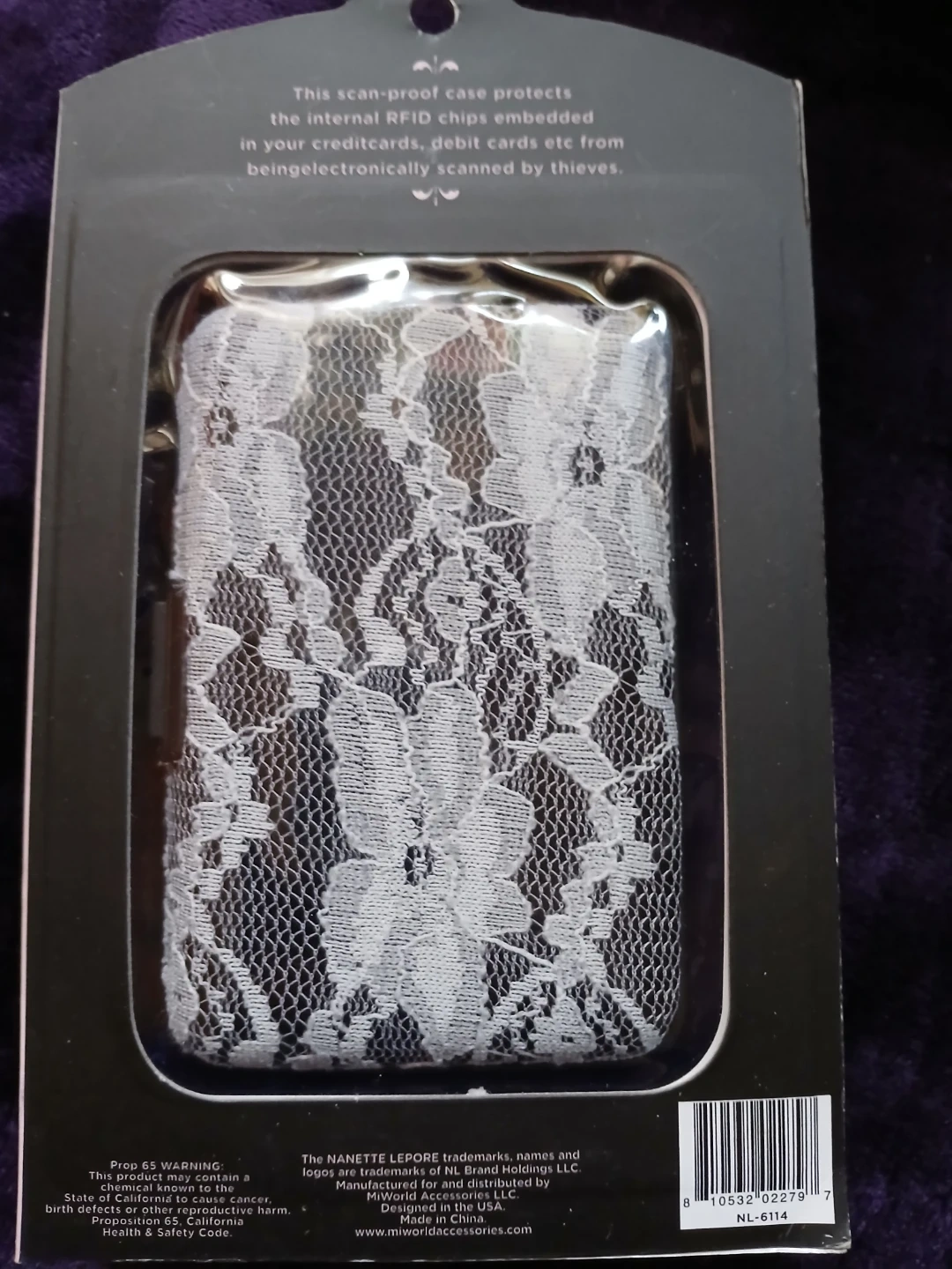 This Nanette Lepore aluminum wallet offers RFID scan-proof protection for your credit cards and debit cards. It's designed to prevent electronic scanning by thieves. The wallet features a stylish floral lace overlay on a metallic finish. Comes in white lace or pink colour's @ $10 each