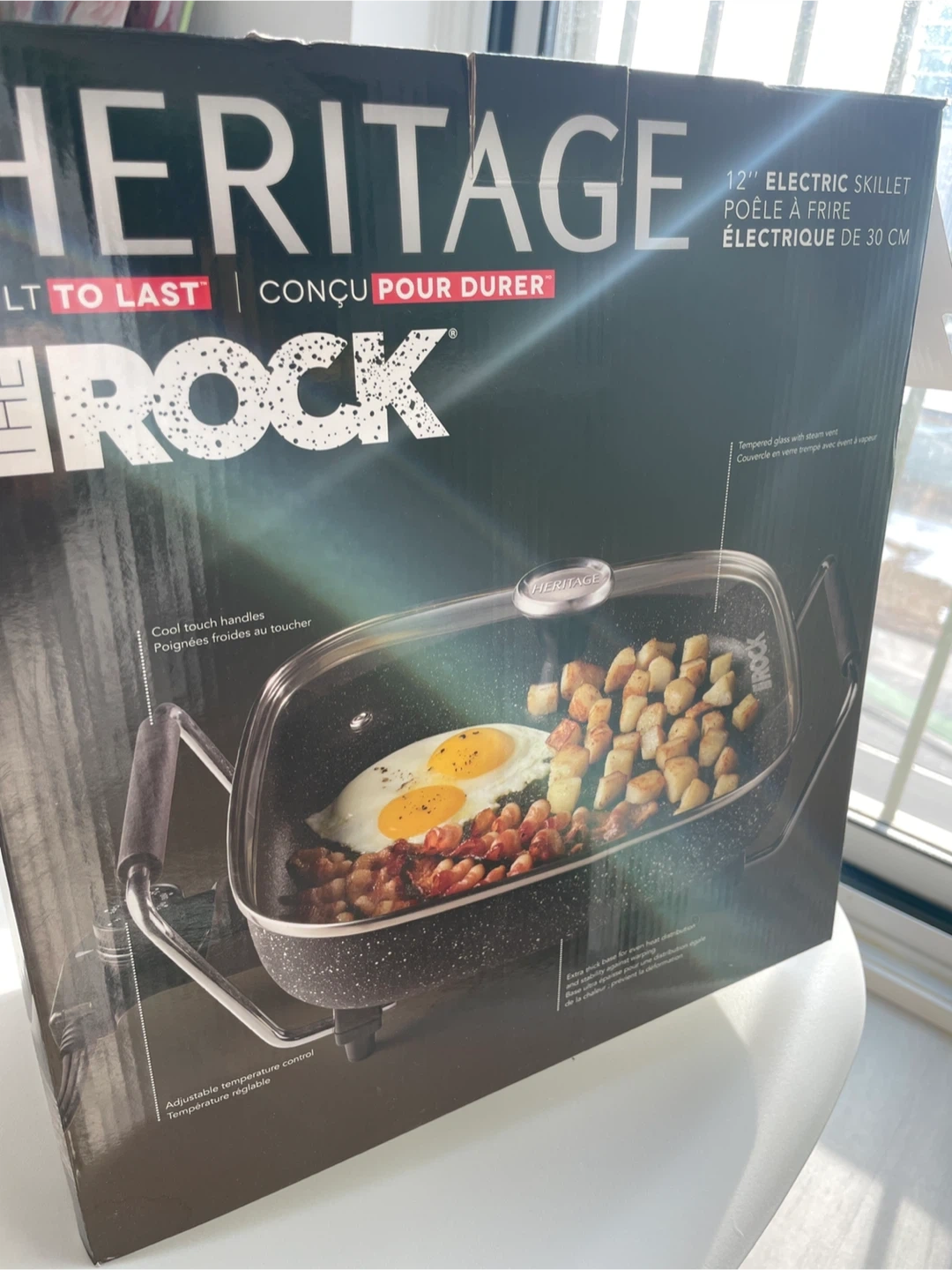 This is a The Rock Heritage 12 inch electric skillet. It features cool touch handles and adjustable temperature control. The tempered glass lid has a steam vent. It's great for frying and cooking a variety of meals!