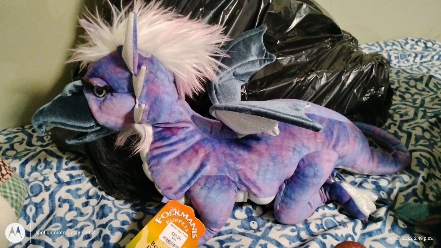 Selling a Folkmanis Dragon Puppet in a lovely blend of blue and purple! This plush puppet is in great condition and ready for imaginative play or display. It's a unique and eye-catching piece. Its never been used the tag says $93.99.