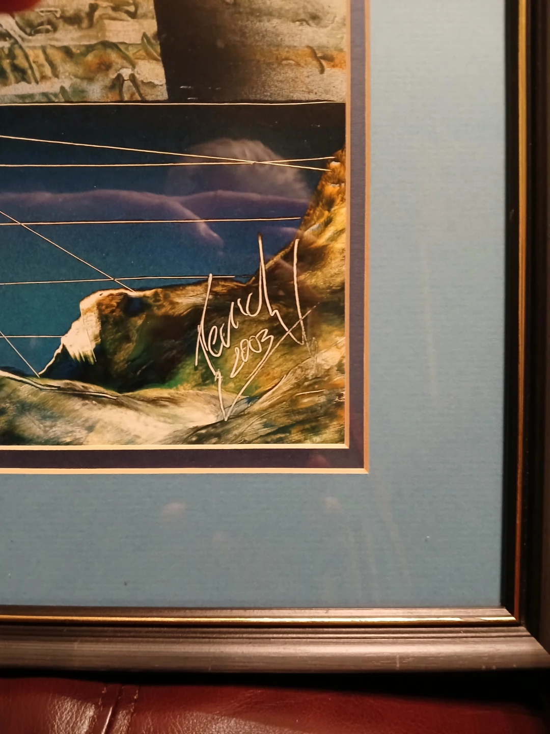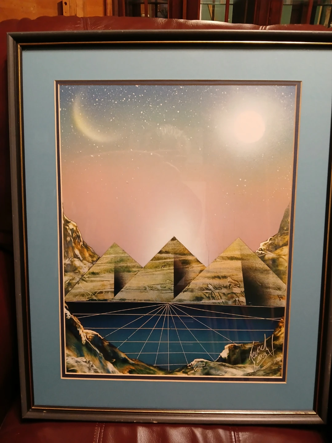 This framed art print features a surreal landscape with pyramids under a crescent moon and sun. It's signed by the artist Kerch and dated 2003. The piece has been professionally framed by Framing & Art Centre in St. Catharines, Ontario. It's a unique piece of art for any collector!